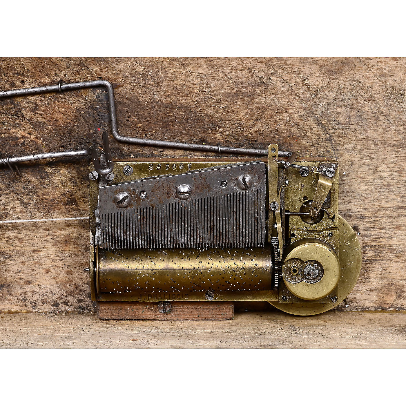 With papier-mâché head, green glass eyes, articulated mouth and carved wood hands holding pipe and rod, perched on sculpted papier-mâché bank above a reflecting pond with glass surface shaded by an apple tree. The fisherman dressed in his original well-preserved green satin jacket, velvet hat and cream-colored breeches trimmed with lace, ribbons and Dresden paper, on ebonized base housing going-barrel motor stamped "J. Phalibois à Paris", eight wood cams, pulley and 2-air pull-string cylinder movement stamped "J. PHALIBOIS", under antique glass dome, ht. 26 in. (66 cm), with modern key, light wear on jacket back and sleeve, one governor blade repaired. - The fisherman turns and nods his head, brings the pipe to his mouth in a philosophical manner, curls his upper lip and dips his rod as a speckled orange carp flits back and forth beneath the pond's surface. - Literature: Mary Hillier, "Automata and Mechanical Toys", p. 114. - No. 2265 in Silver & Fleming's 1884 catalog. - A rare and humorous automaton in good original working condition.