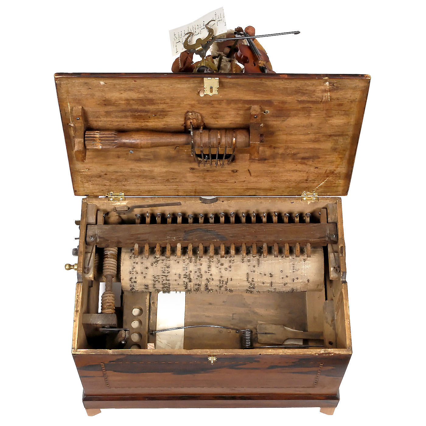 With six-air barrel operating five cams that cause the monkey musician to move his head, blink and chatter while playing the cello with two movements of the right arm, in paper-edged silk tailcoat, silk breeches and embroidered waistcoat, a tricorn hat, music stand and instrument case at his feet, on veneered and inlaid base with replacement tapering feet, height 22 in. (56 cm), barrel 12 in. (30 cm), organ in playing condition. Monkey's face restored, head and eye movements inactive - in need of adjustment, cello, bow and music stand appropriately replaced. With two cranks. - An attractive example of this popular piece.