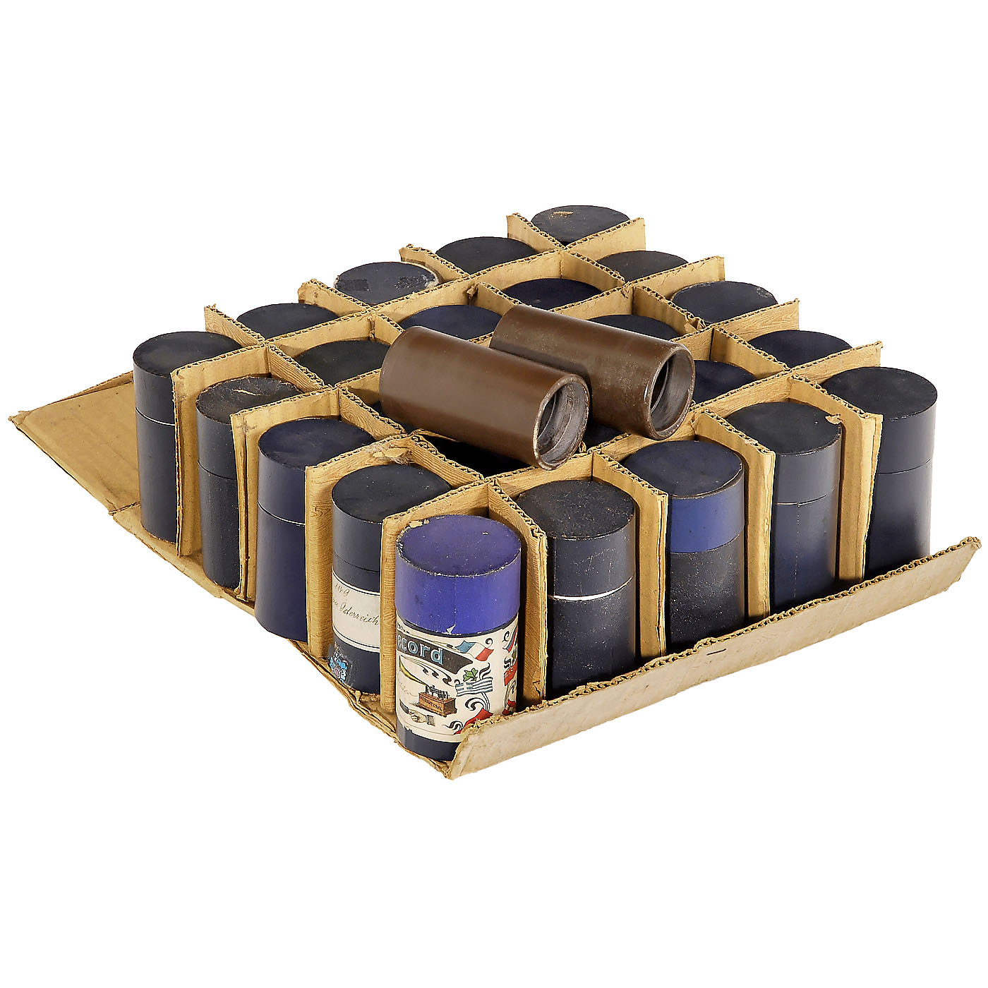 Problably by Jérôme Thibouville Lamy, Paris. For 2-minute wax cylinders, reversible case, Pathé reproducer, brass horn, stamped "Selon La Loi", Ø 10 1/5 in., working condition, serial no. 14562, with 25 wax cylinders in boxes.
