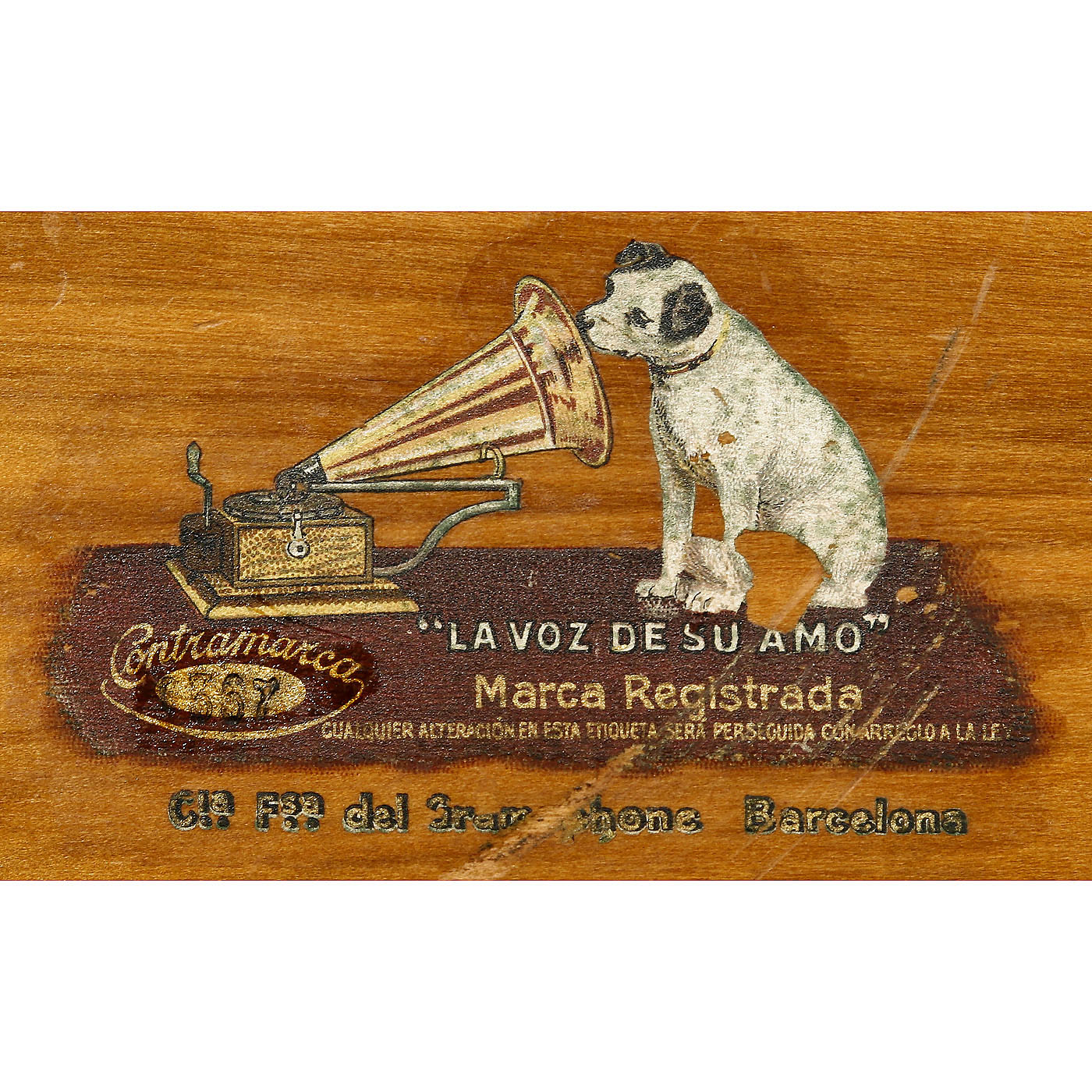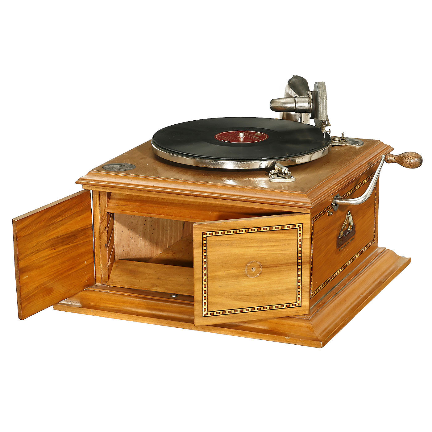 Trade name for Spain: "La Voz de su Amo", light mahogany-veneered case with banding, original plaque and decal, working. Doors missing knobs.