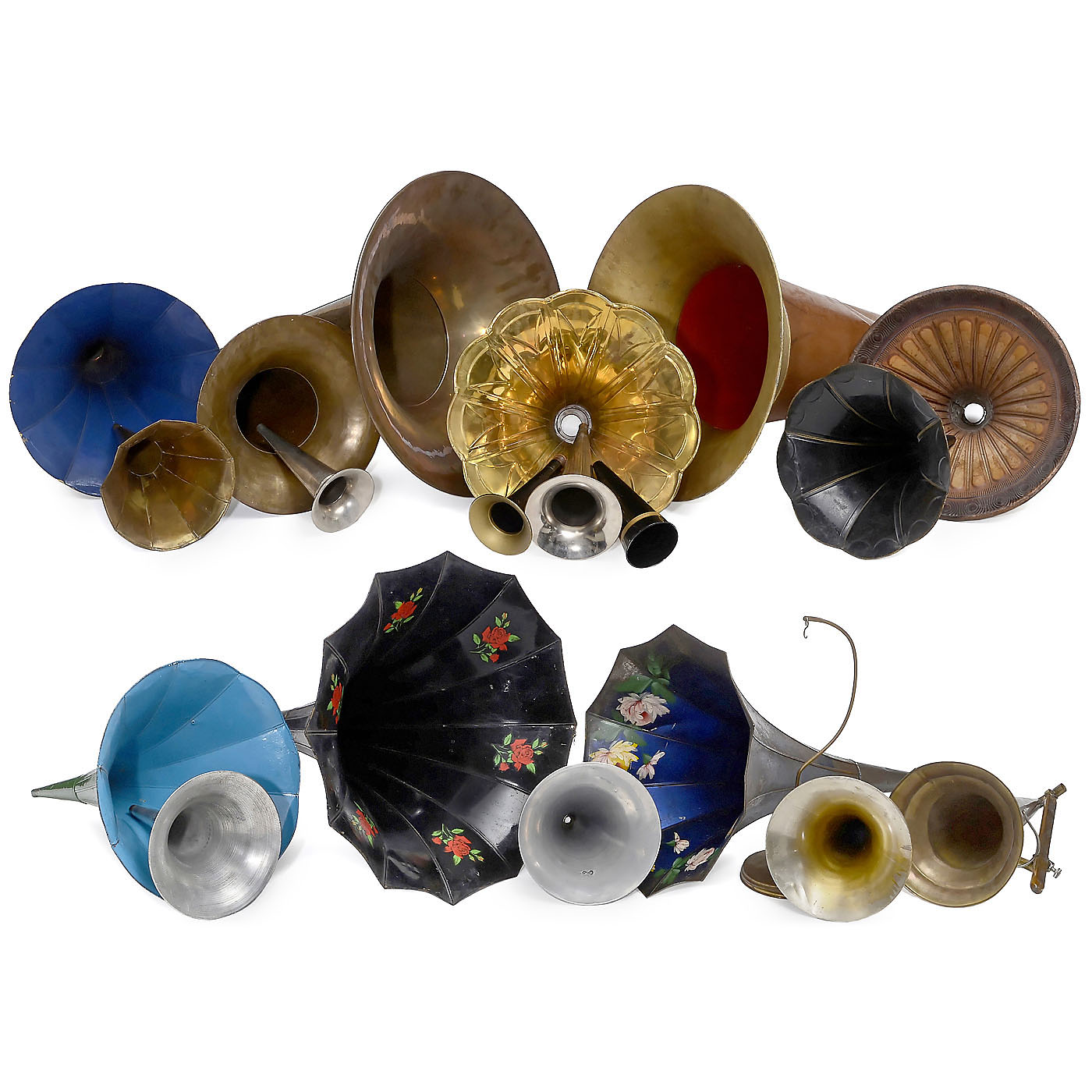 Edison Triumph and Standard, 2 French Pathé aluminum horns, 1 French bugle horn, brass horn with traveling arm, extra-large metal horn Ø 22 7/8 in., large brass horn Ø 23 3/5 in. and others.