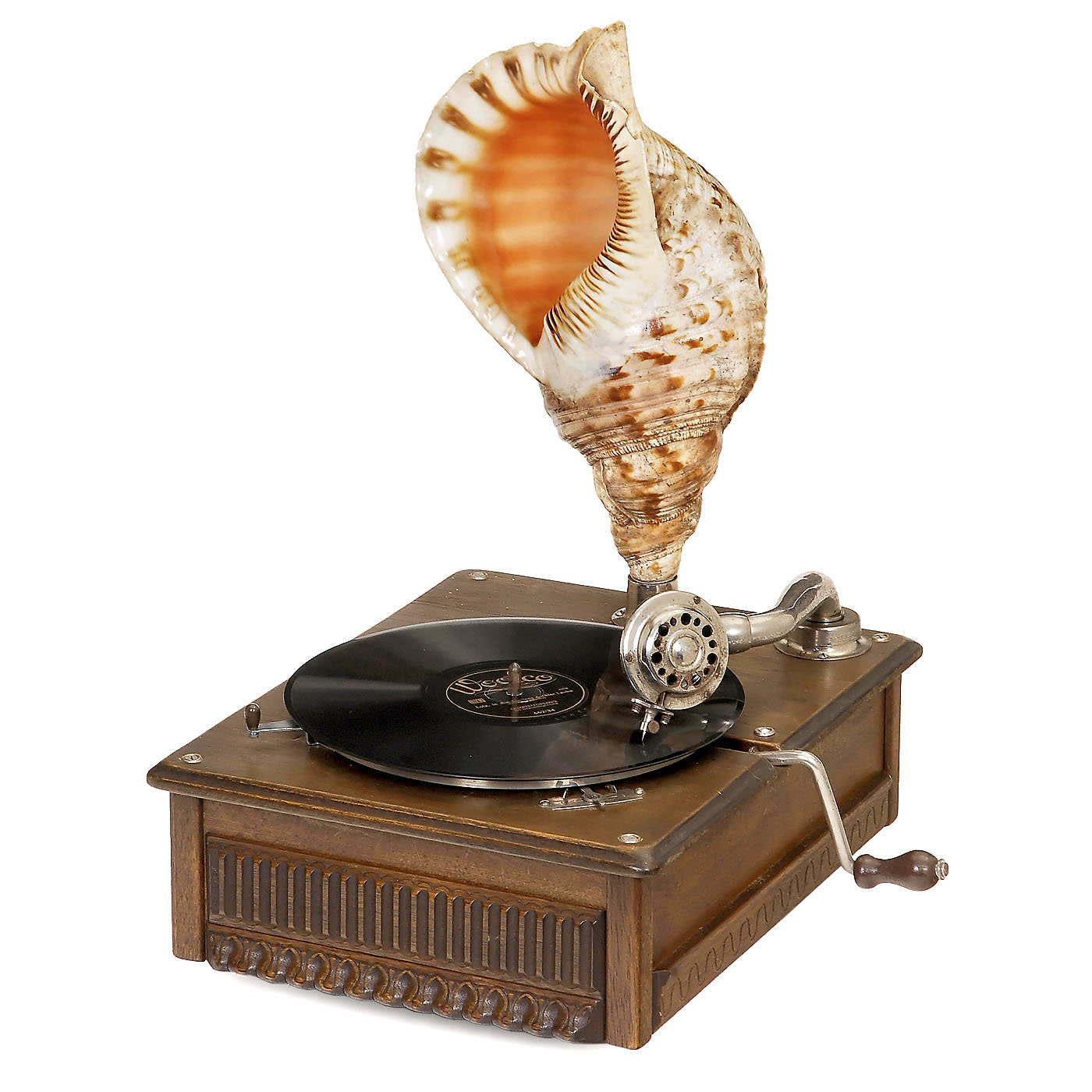 Walnut case, metal membrane soundbox, spring-driven, horn formed of the Charonia Tritonis shell. With astonishing sound, a most curious rarity.