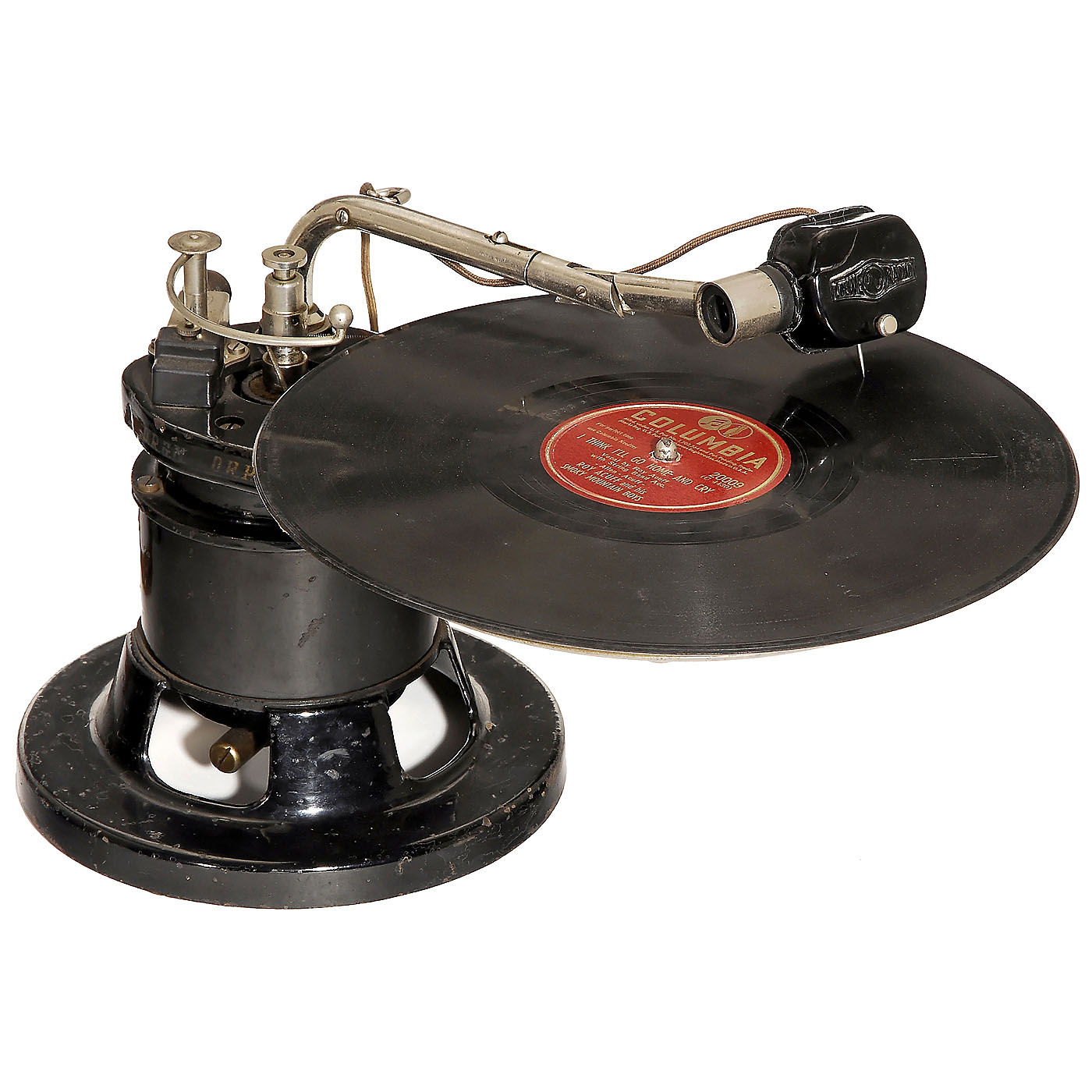 Model 1000, manufactured for NSF (Nederlandsche Seintoestellen Fabriek) by Dr. Max Levy, GmbH, Fabrik elektrischer Maschinen und Apparate; Berlin, for 78-rpm discs, mains power (125 V), belt drive, Loewe magnetic cartridge for steel needles (crack in housing), automatic shut off, very rare.