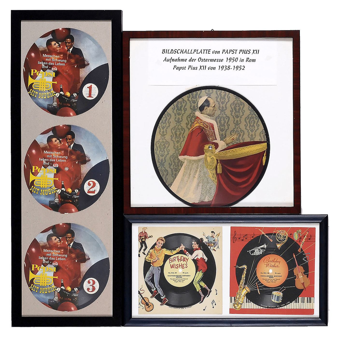 1) 2 pictures discs "Birthday Wishes". - 2) Special shellac discs: Standard Record, United Record, Aretino Record and Busy-Bee Record. - 3) 3 advertising discs: C&A, Persil and Electro. - 4) Pope Pius XII picture disc. - 5) Deutsche Grammophon silver disc. - 6) Universal Pictures soundfilm disc "Sons of the Saddle", Ø 17 in. - And: 7) 3 Pepsi picture discs.