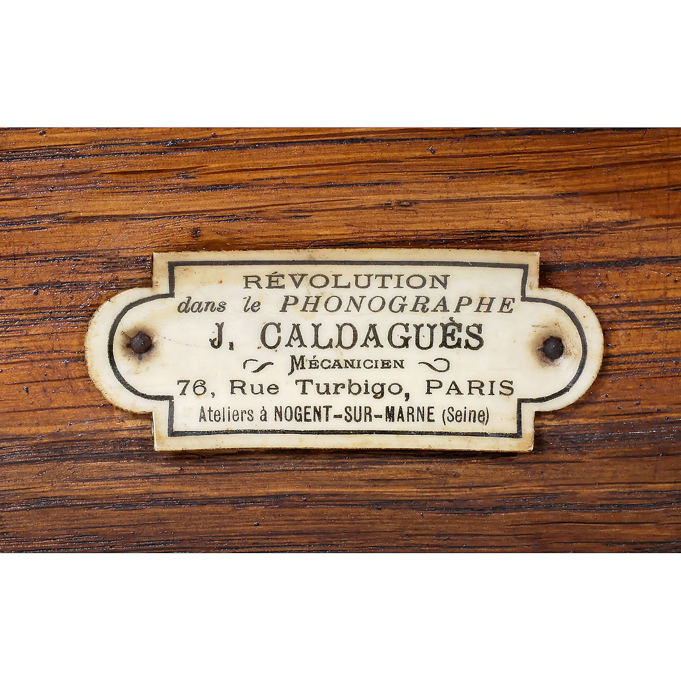 No. 456, bedplate inscribed in English and Russian, 7 in. turntable, zinc-horn on metal bracket with wood tone arm, oak case, 4 corner columns, 2 beveled glass sides, working, "Caldaguès, Paris" dealer's plaque, with 1 Zon-O-Phone disc "Spanita Waltz".
