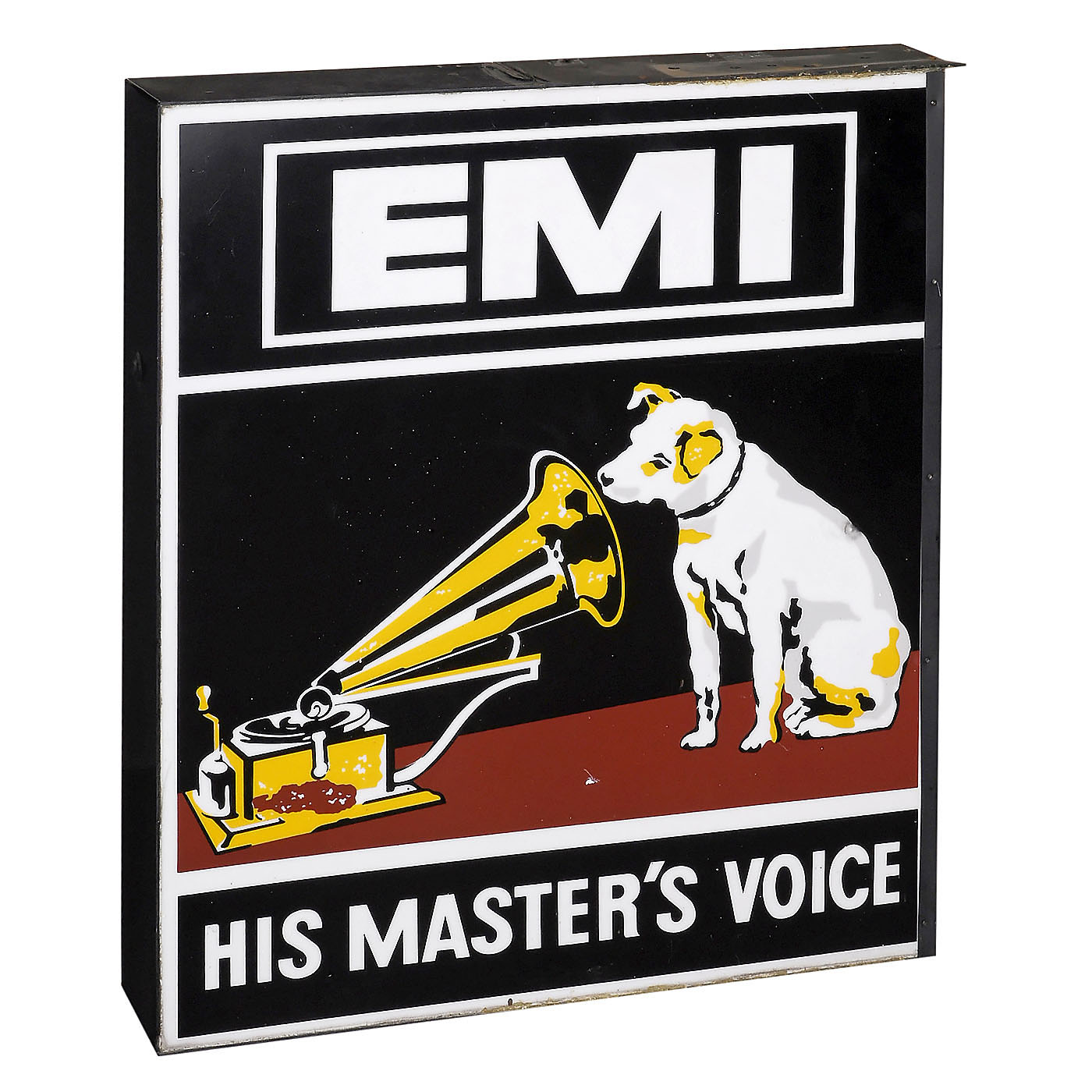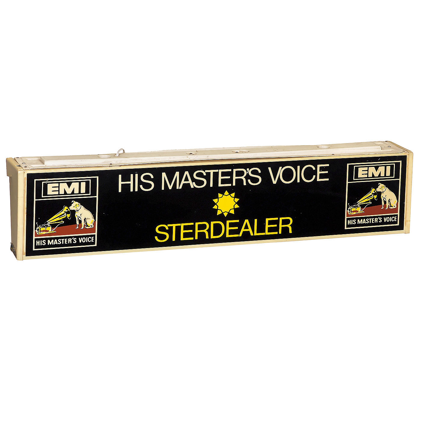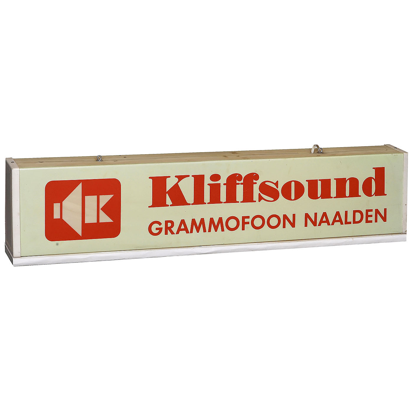 Double-sided, plastic and metal, needs new lighting, size 32 x 37, 23 x 44 and 40 x 9 in. - In addtition: "Kliffsound Grammofoon Naalden", 40 x 8 ¾ in.