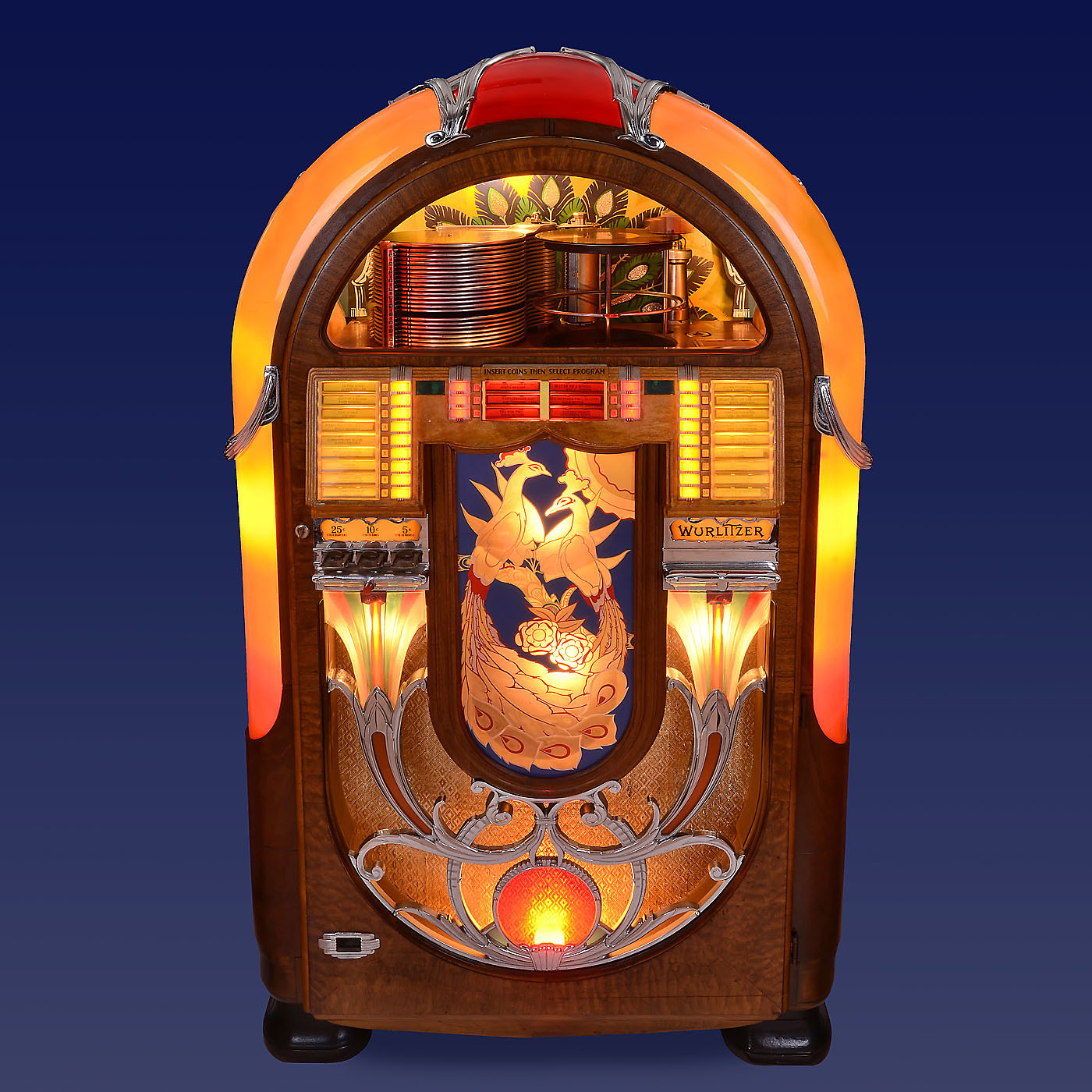 Style 850, American jukebox for 24 records (78 rpm). Manufactured by Rudolf Wurlitzer Company, North Tonawanda, New York, USA. Designed by Paul Fuller. Size: 38 x 26 x 68 in., coin-operated (5, 10 and 25 U.S.-Cents), an extraordinarily attractive jukebox, central painted glass panel decorated with a pair of peacocks, illuminated by two rotating polarizing discs, flanked by bubble tubes, illuminated Catalin plastics, extensively chromed metal ornaments, Paldao and Robinia burr-wood veneer. A very sought-after collector's item, excellent restored and working condition. With 24 shellac discs. Reminiscent of the Roaring Twenties and Wurlitzer's last jukebox before the US entry into World War II.