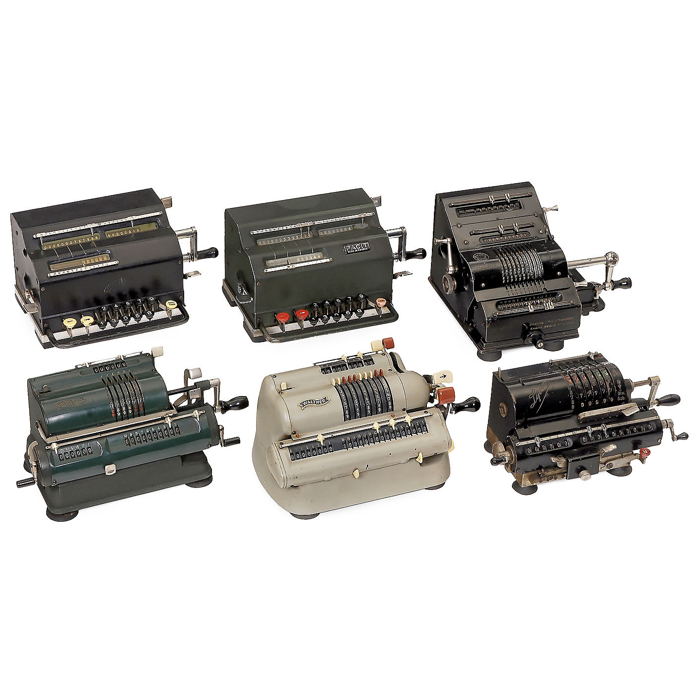 1) Brunsviga Nova 13Z, no. 130732, 10, 8 and 13 digits, working, c. 1935. - 2) Facit TK, no. 151675, 9, 8 and 13 digits, working, c. 1950. - 3) Walther WR 10, Nr. 71419, 6, 6 and 10 digits, working, c. 1952. - 4) Facit T, early no. 3310, 9, 8 and 13 digits, working, c. 1935. - 5) Lipsia 11R, Otto Holzapfel, Leipzig, 6, 6 and 10 digits, defective, c. 1935. - And: 6) Walther WSR 160, no. 217000, 10, 8 und 16 digits, working, c. 1960.