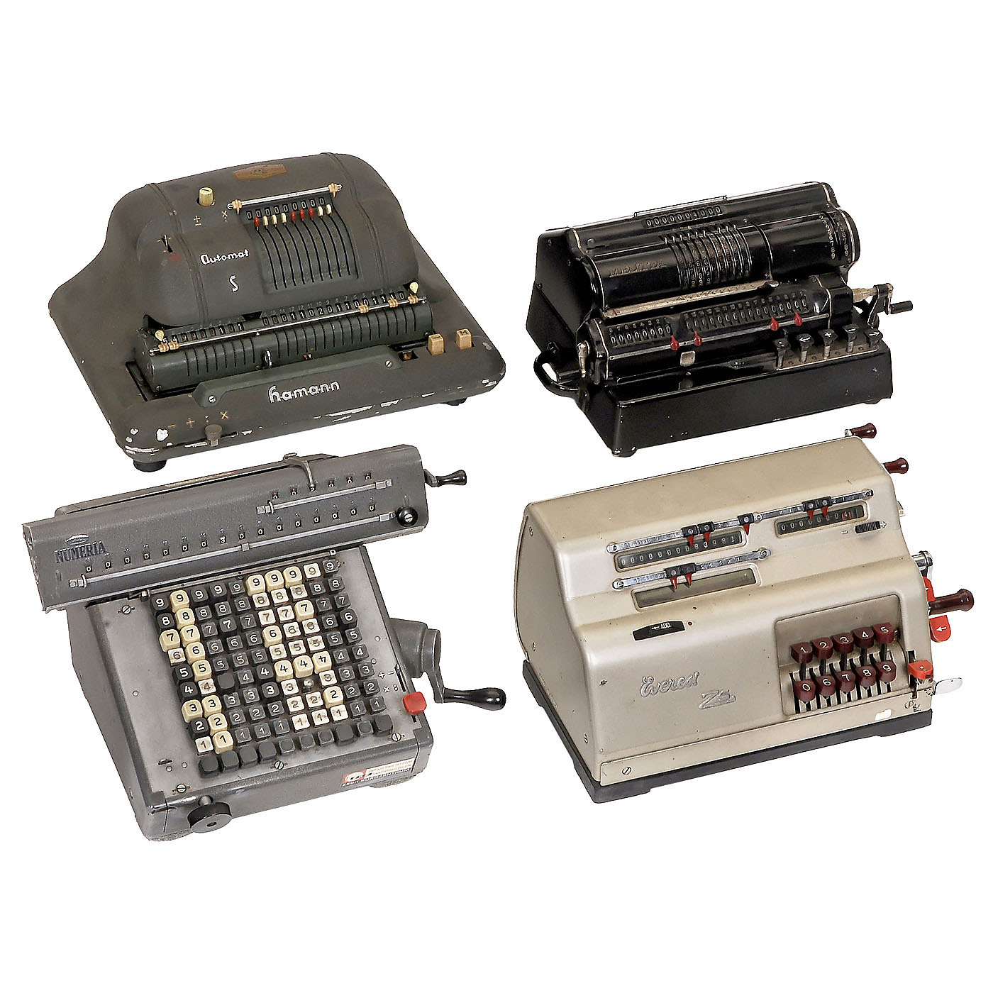 1) Everest Z5, manufactured by Officine Serio, Italy. 9, 8 and 13 digits, 2-row numerical keyboard, working, 1951. - 2) Melitta EI/16, VEB Fortuna Werke in Suhl, GDR, 10, 8 and 16 digits, electrical function untested, 1951. - 3) Hamann Automat S, Christel Hamann, Berlin, 9, 8 and 16 digits, electrical function untested, missing 1 key top, 1954. - And: 4) Numeria, SICMV, Italy. 10, 6 and 16 digits, missing 1 key top, working, 1953.