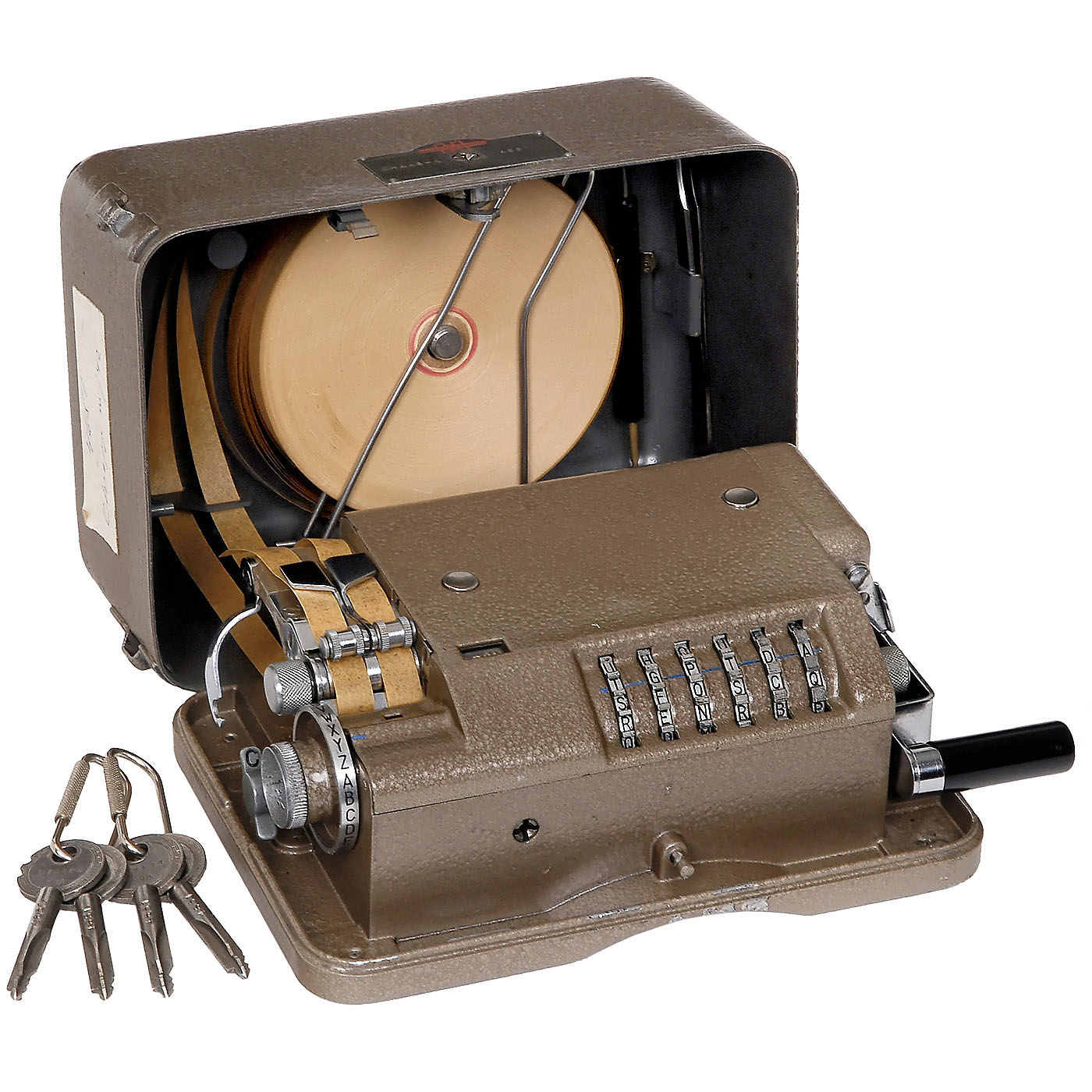 Hagelin Cryptographer, manufactured by A.B. Cryptoteknik, Stockholm. No. 4651, mechanically-operated, with 6 coding wheels, 2 paper tapes and printers, metal case with grained finish, with keys and leather case. Working condition.
