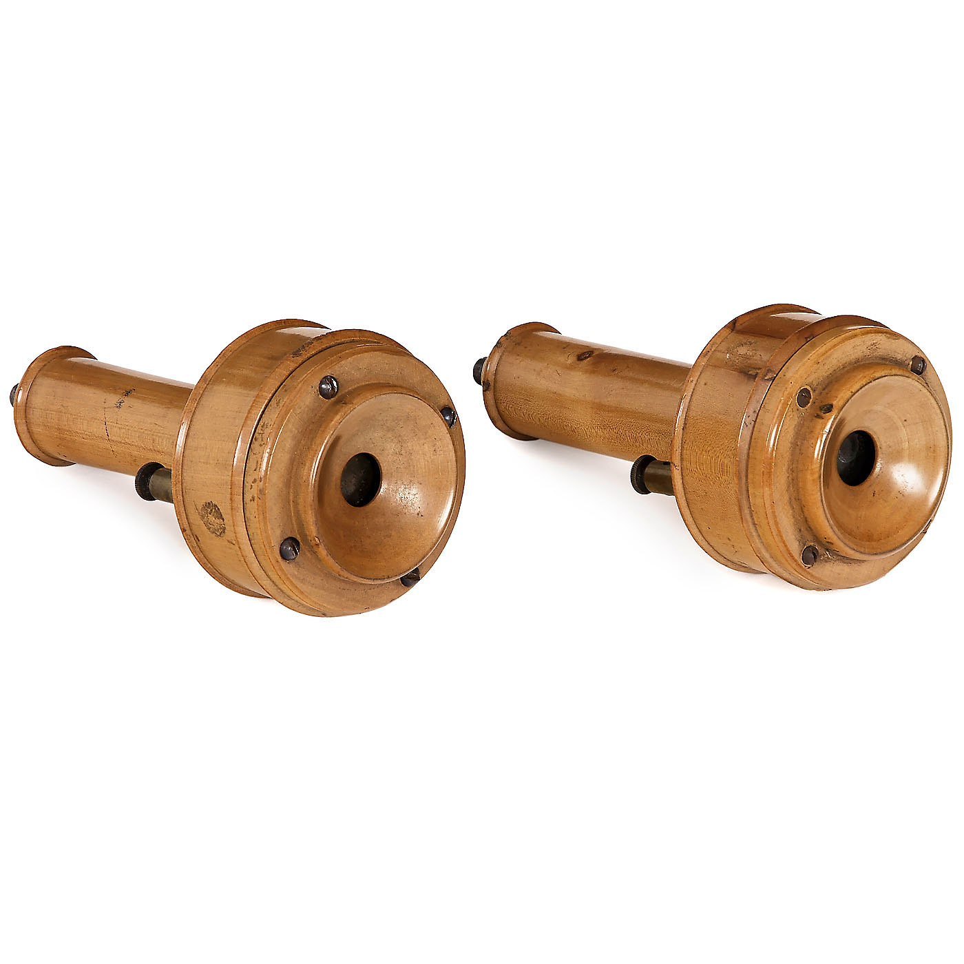 Unmarked, butterstamp telephones, white beech, for speaking and listening, with horseshoe magnet, height 6 ¼ in.