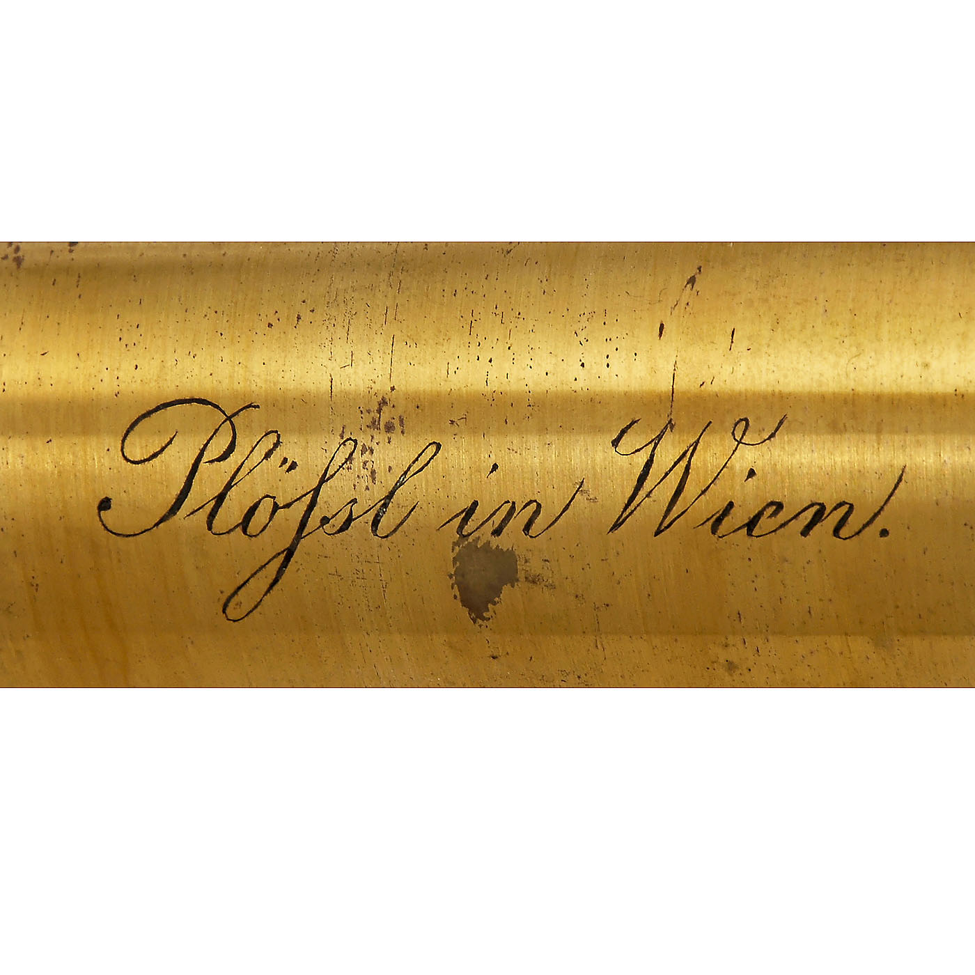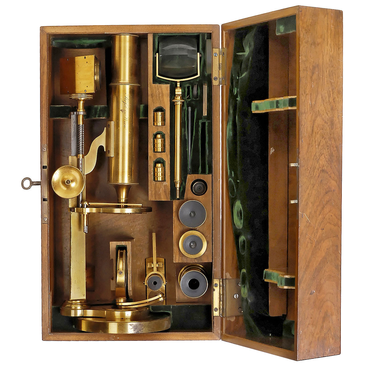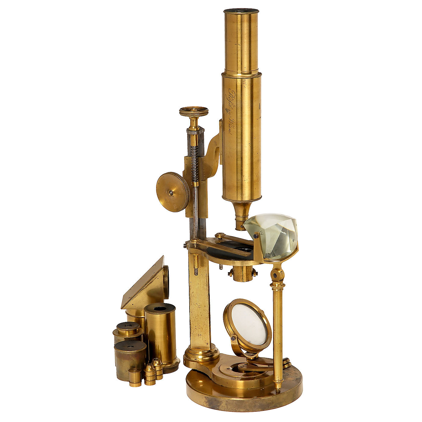 Signed on the tube "Plössl in Wien", original lacquered brass, height 16 1/6 in., 2 three-part threaded lenses numbered 1-3 and 4-6, 2 lenses with correction, 4 eyepieces (one aplanatic to screw in), 2 micrometers, 1 large Selligue prism, 1 deflection prism for the tube, coarse and fine adjustment acting on the tube, height-adjustable diaphragm device with rocker arm adjustment under the table. The microscope is mounted rotating on a heavy brass base. Very good original mechanical and optical condition. The box is accompanied by a handwritten magnification table showing that all previously supplied optical equipment is complete. In velvet-lined case. - A rare top instrument in complete and very good condition.