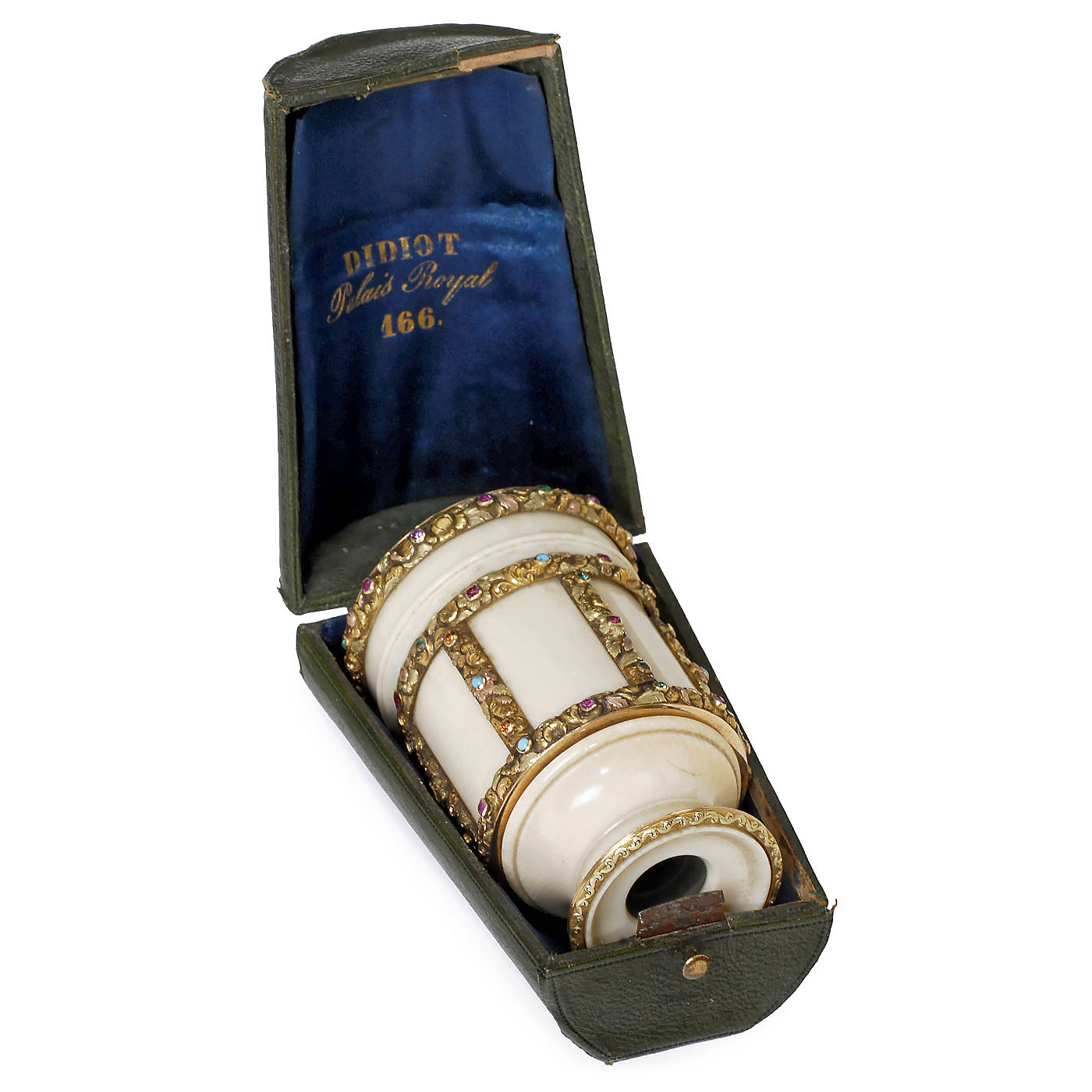 Signed on inner tube "WIRGMAN, fecit, London", bone body and eyecup (2 stress splits) decorated with chased 18k-gold bands with floral and foliate motifs and set with gems of amethyst, turquoise, ruby and emerald. In silk-lined and green leather-covered original case by "Didiot, Palais Royal, 166". Provenance: Asprey & Garrard, London.