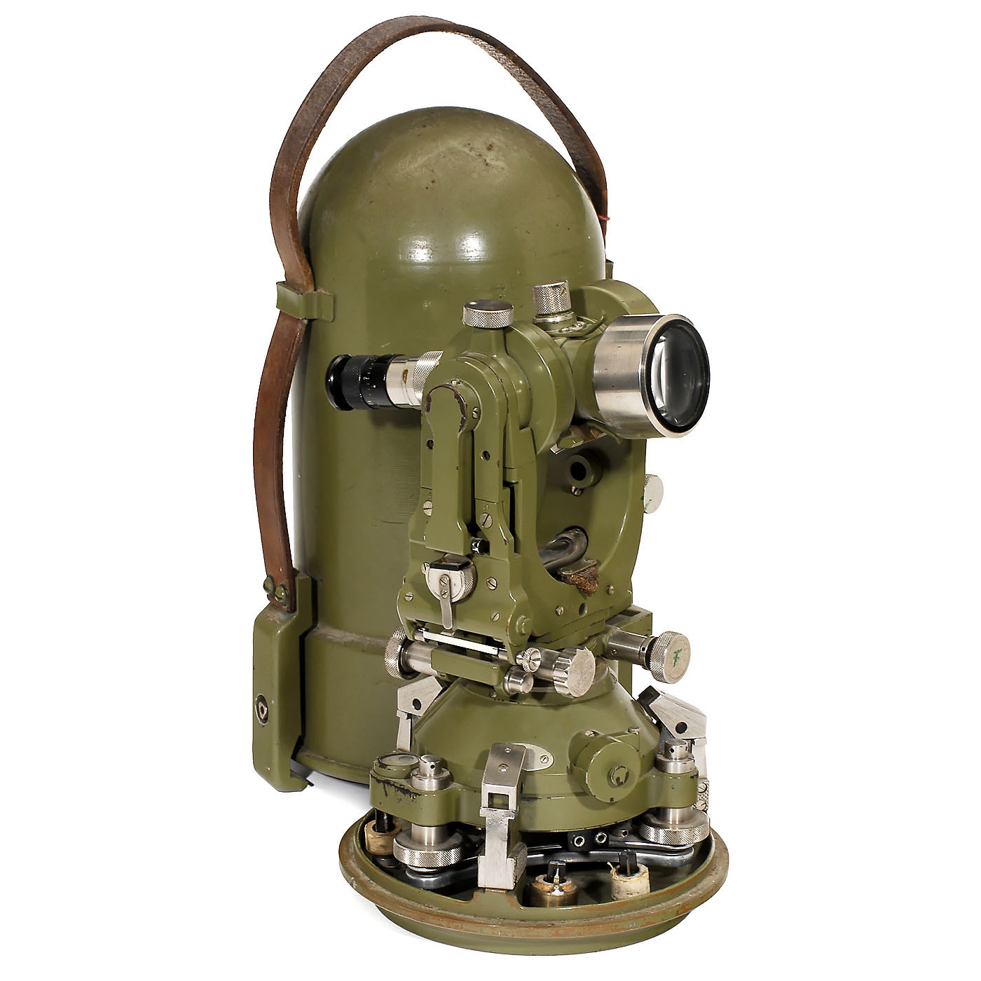 Swiss universal optic-mechanical precision instrument by Wild, Heerbrugg, no. 238, 2 bubble levels, prism for the vertical circle illumination, missing prism for the horizontal circle illumination, 24x magnifying telescope, length 6 9/10 in., overall height 9 ¾ in., with original container.