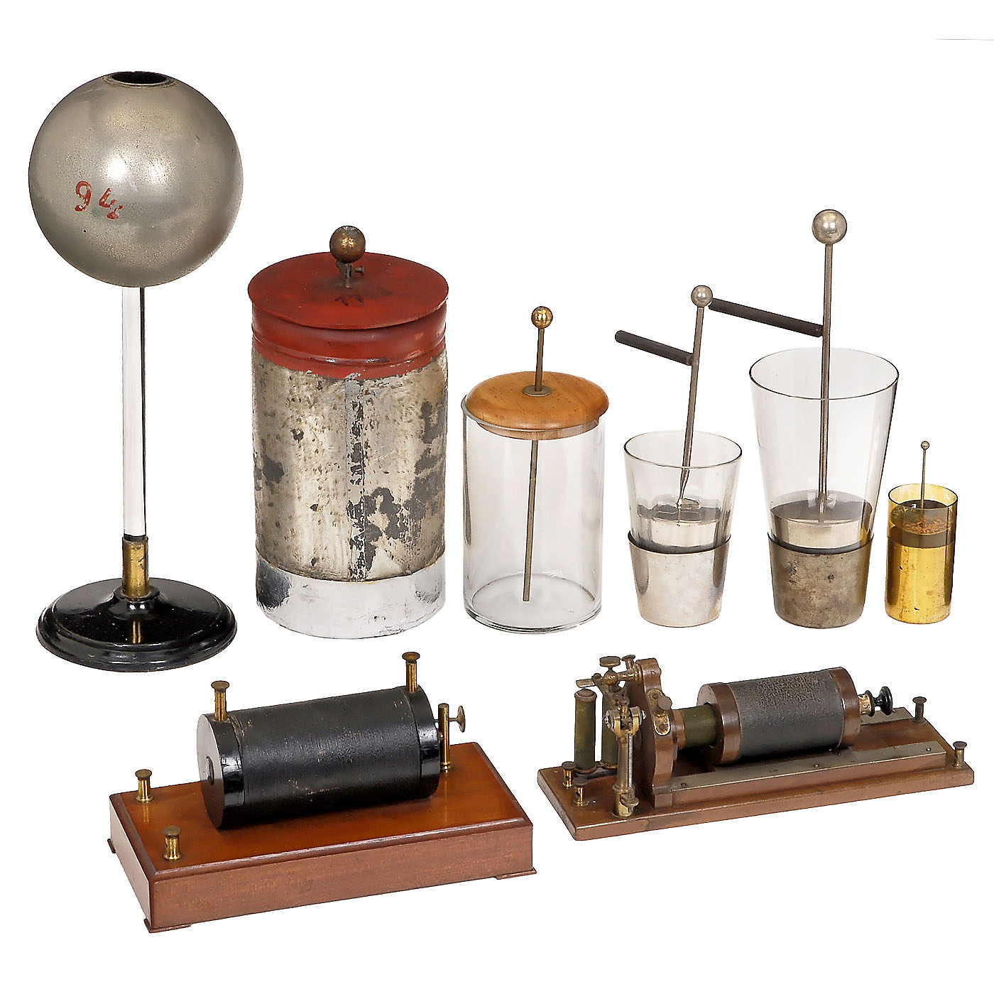 1) Coil on mahogany base, 9 7/8 x 4 ¾ in. - 2) Sliding induction coil, 11 x 3 ½ in. - 3) Conductor, on glass pillar, height 16 ½ in. - And: 4) 5 glass vessels for electrostatic experiments.