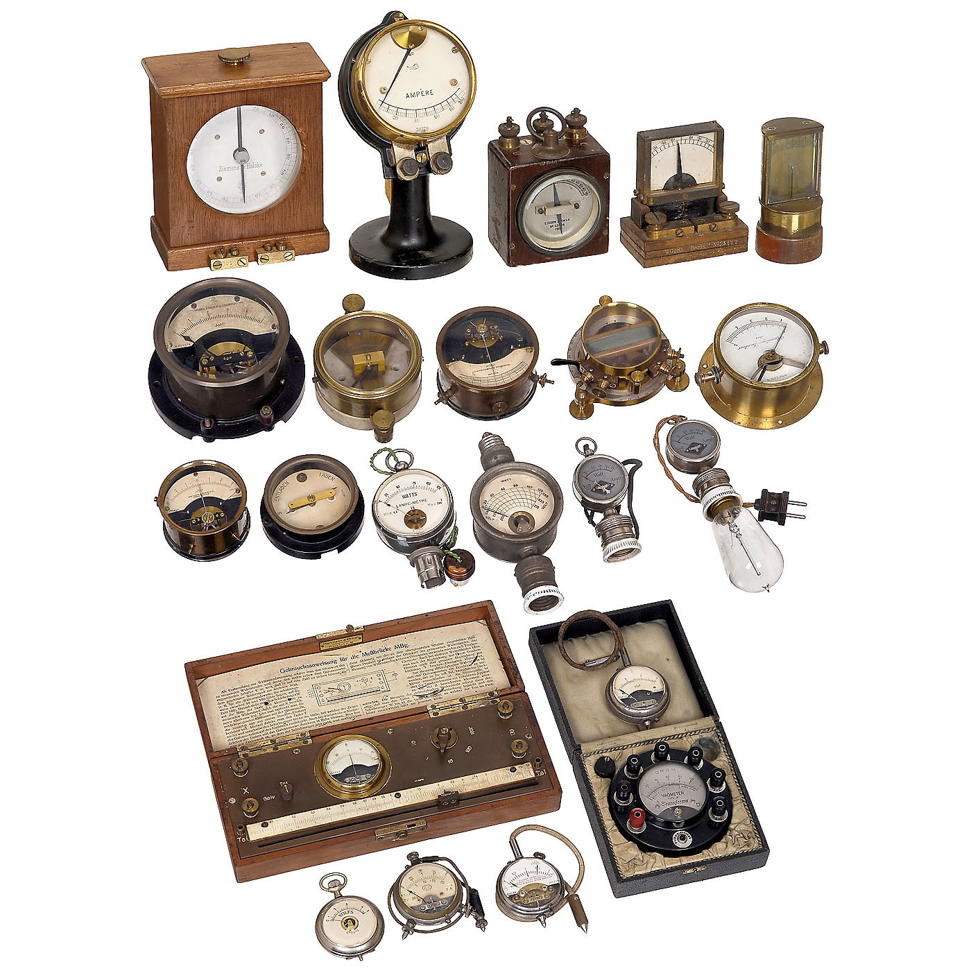 1) Vaometer, Type R, Transforma, D.R.G.M. - 2) 3 wattmeters, with bulb sockets. - 3) Wattmeter, with bulb socket and early Sirius bulb. - 4) 2 pocket-watch shape meters, one by Siemens & Halske. - 5) Military voltmeter by Siemens & Halske. - 6) Military voltmeter by AEVD. - 7) Measuring bridge by Hartmann & Braun. - 8) Galvanometer by Edison & Swan. - 9) Battery-charge indicator by Siemens & Halske. - 10) Milli-amperemeter by Nederlandsche Instrumenten fabriek. - 11) Galvanometer from a Siemens telegraph. - 12) Voltmeter by Hartmann & Braun. - 13) Galvano meter by Gurtl, Berlin. - 14) Amperemeter by Hartmann & Braun. - 15) Galvanometer by Siemens & Halske. - 16) French amperemeter by Appareillage Genteur. - 17) 2 unmarked instruments. - And: 18) Early measuring instrument by Siemens & Halske, Berlin, original lacquered brass, silvered scales, c. 1880.