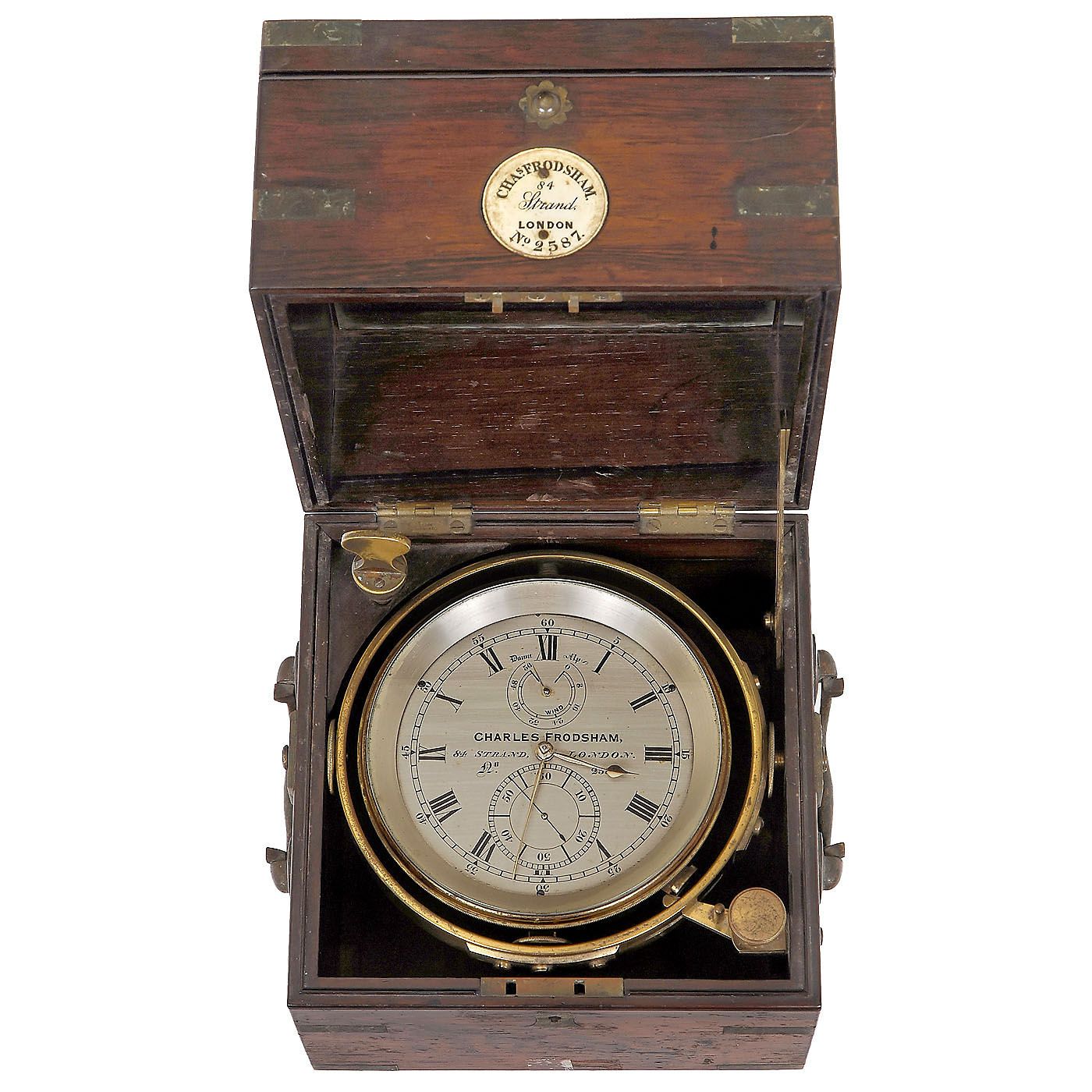 England, No. 2587, 4 in. silvered dial, marked "Charles Frodsham - 84 Strand - London", with fusee movement, subsidiary seconds dial and up-and-down dial for 56 hours, in gimbaled brass bowl and brass-bound double-lidded case marked on bone plaque "Chas Frodsham, 84 Strand, London No. 2587", 2 brass handles, with key (split in lid, case with good original finish, but in need of cleaning). Working.