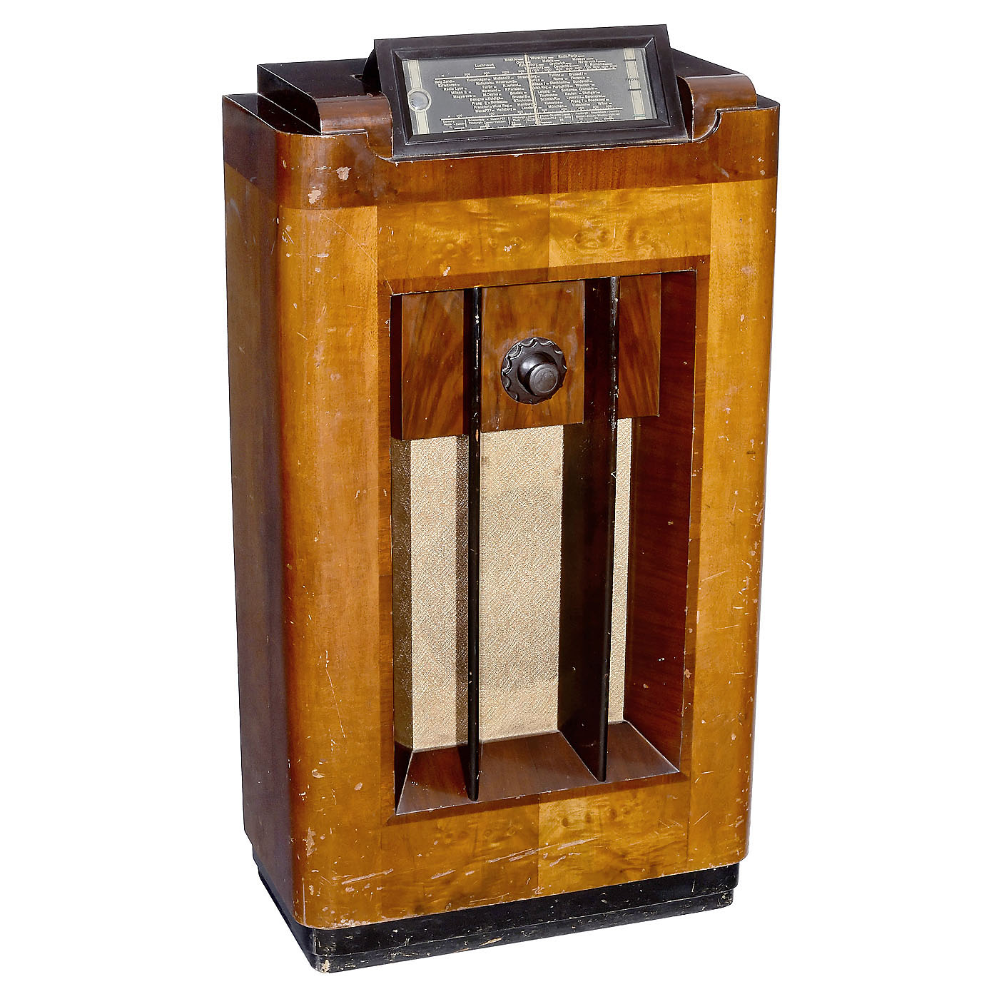 Eindhoven. 6 tubes, broadcast, long and short wave, mains-operated, integrated speaker, wood floor case, bakelite tip-up tuning dial, complete with rear panel and all components. Size: 20,5 x 11 x 38 ½ in. Unusual joystick operation.