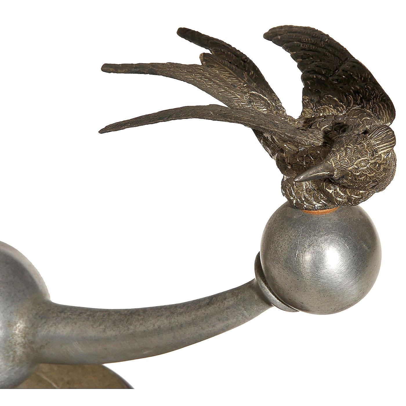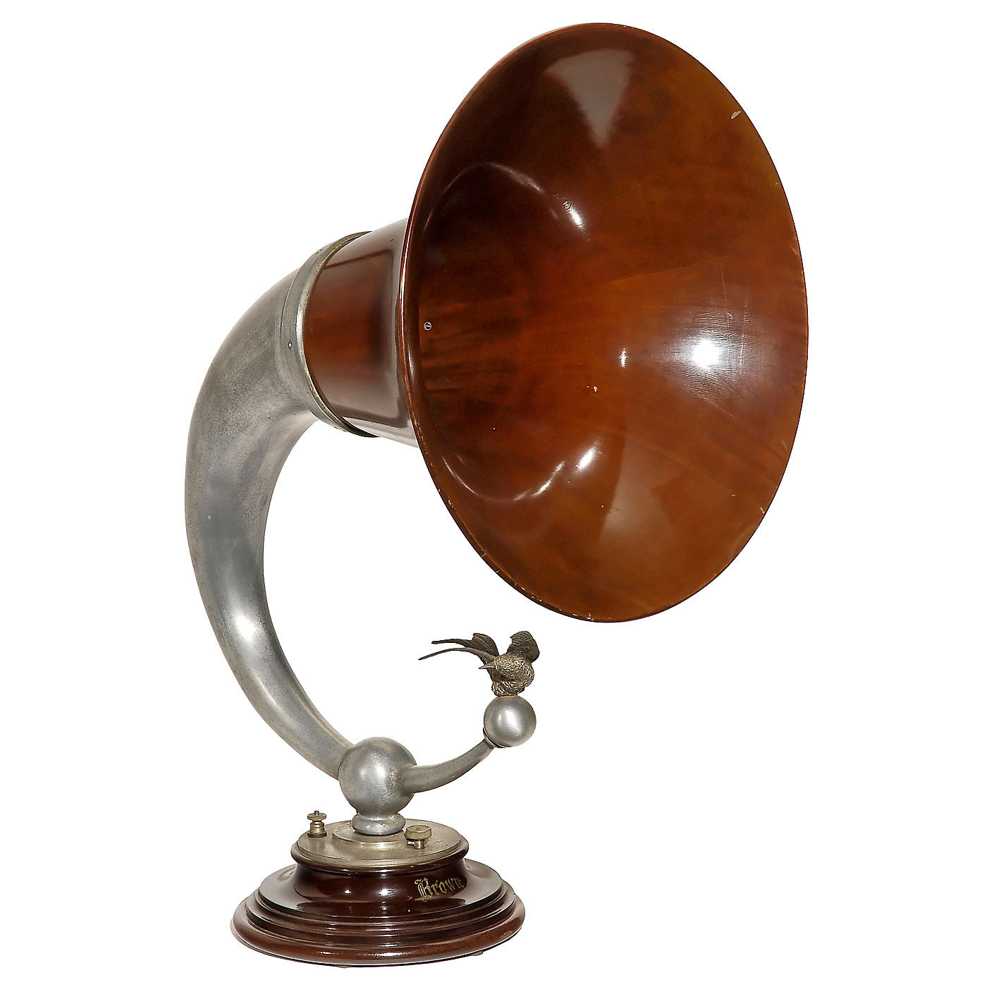 England. Mahogany base and horn, aluminum neck with bluebird perched on the tip. A deluxe Art-Deco radio horn!
