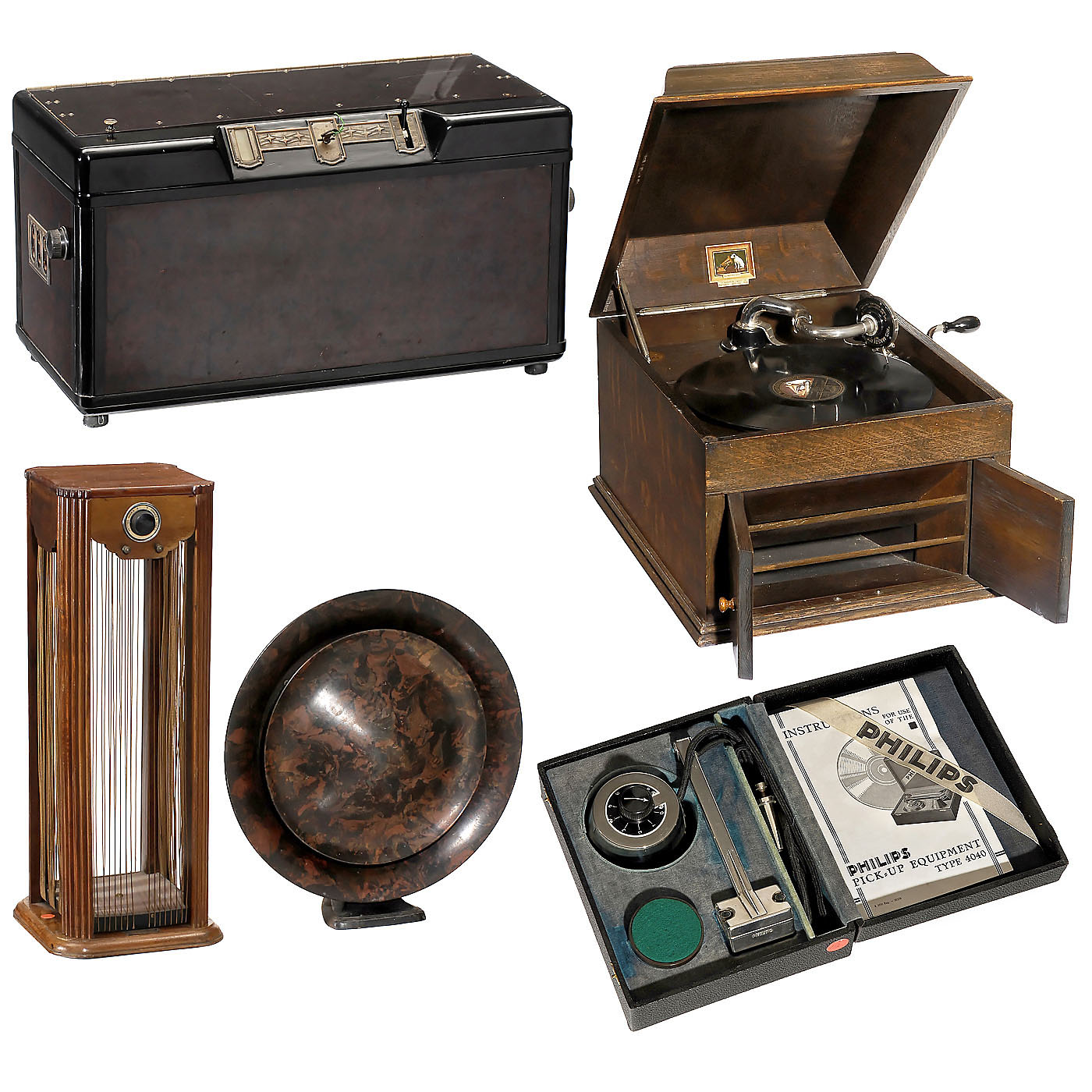 Consisting of: 1) Philips. 5-tube receiver, model 2511, LW + MW, mains-operated, complete with all components. - 2) Philips. Loudspeaker, model 2007, bakelite, Ø 17 ¾ in. - 3) Carac, Paris. Loop aerial, model Cadre 760, MW + LW, height 25 in. - 4) His Master's Voice. Gramophone, model 109, no. 4 reproducer, spring-driven (working), oak case. - And: 5) Philips. Pick-up equipment, type 4040, electrical, complete, near-mint, in box.