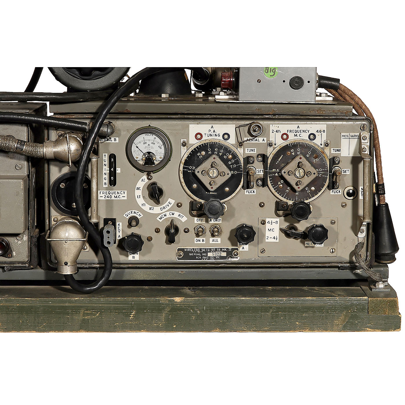 WWII mobile radio transceiver, used by the British Army, manufactured by RCA, USA. Metal case, 15 tubes, with supply unit, transceiver, aerial variometer and aerial base, size 27 1/5 x 12 ½ x 17 ¾ in.