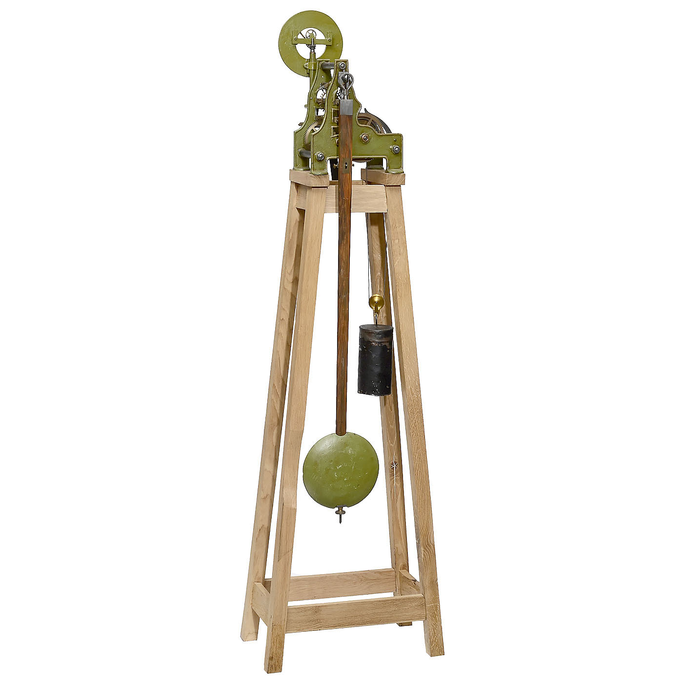 No. 2737, with plaque "B. Zachariä, Kgl. Sächs. & Herz. Altenb. Hoflieferant - Leipzig". Cast-iron frame, brass wheels, weight-driven pendulum movement with Graham anchor escapement, subsidiary dial with Roman numerals, on wood stand, overall height 78 in. Working, with crank.