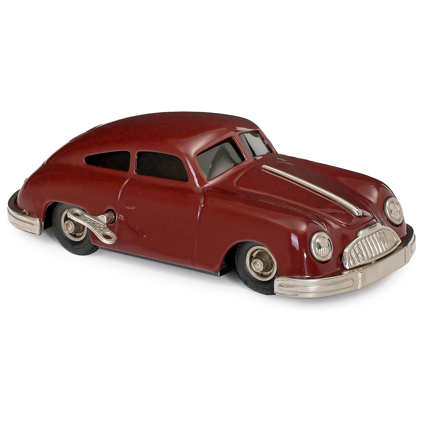 Gescha, Nuremberg, Made in Western Germany. Wine-red-lacquered tinplate, lithographed baseplate, chromed bumpers, rubber tyres, spring-driven (working), mechanical marvel car, with 6 pre-set travel routes, length 8 ½ in., with Gescha key. - Very good condition!