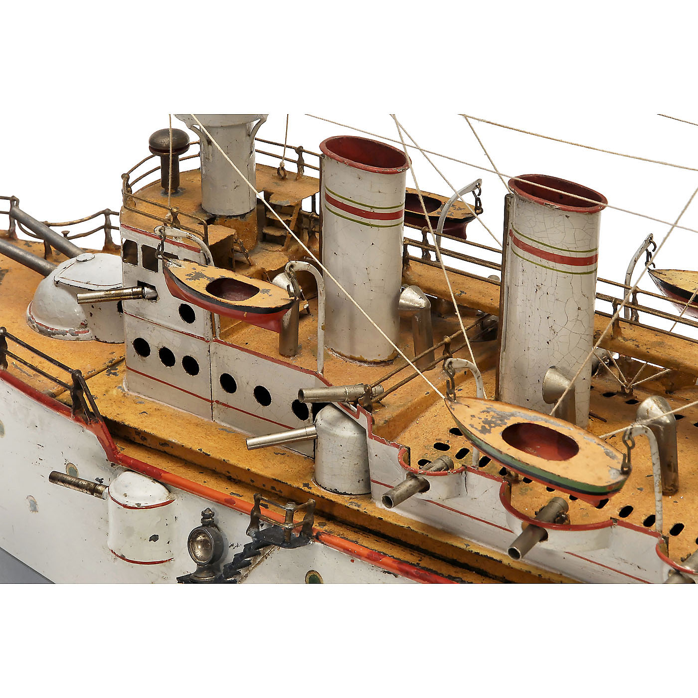 Gebrüder Bing, Nuremberg. Twin-screw steamer, 2-cylinder steam engine, metal hull and superstructure, extra fine hand-painted finish, equipped with 6 lifeboats, 2 anchors at chains and winds, 4 barbette guns, 4 guns in casements, 20 cannons, 4 dummy searchlights, 4 funnels, 2 masts with crow nests, detachable upper deck, length 32 in. - Very good original condition, without repair or retouch. - With German imperial war flags. The largest Bing boat in the 1909 catalog, No. 150/213. Deck retains original GBN decal, on stand with wheels.