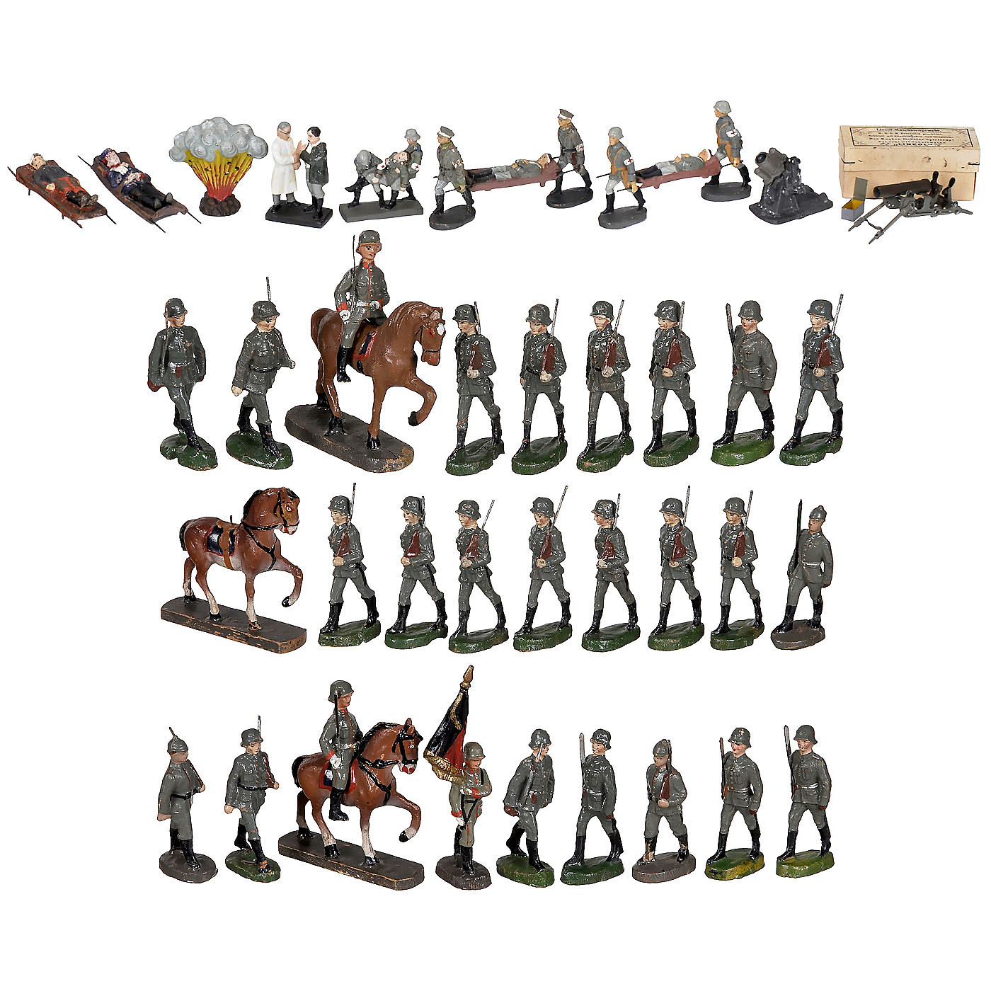 2 wounded soldiers on stretchers, World War I; doctor with patient; 2 soldiers with wounded comrade; 4 soldiers with 2 stretchers; 1 canon; 1 explosion and machine gun in original box. 27 Elastolin soldiers, composition figures, 3 in., including 2 riders and a banner-bearer.