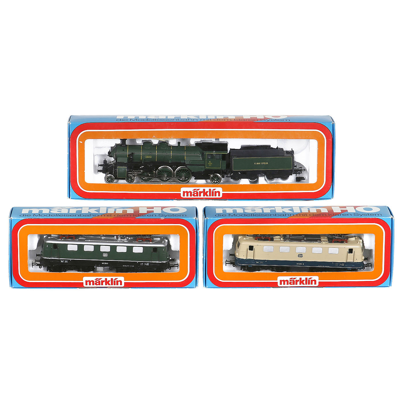 1) 3046, French locomotive series 150X SNCF, cast metal, plastic tender. - 2) 3108, series 44 DB, special edition "125 years Märklin anniversary", in original box. - 3) 3034, electric locomotive, series 41 DB, beige/turquoise, in original box. - 4) 3037, electric locomotive, series 41 DB, green, in original box. - 5) 3092, Bavarian steam locomotive, series S3/6, green/black, in original box. - 6) 3053, series E03 DB, version 1, in original box. - 7) 3040, series E40 DB, version 2, in original box. - 8) 3155, series 111 DB, version 2, in original box. - And: 9) 20 freight wagons: 4534 "Spa Reine" - 4569 "Pabst Blue Ribbon" - 4567 "Gösser Bier" - 4566 "Wasabröd" - 4417 "Alpirsbacher Klosterbräu" - 4536 "Tuborg" - 4562 "Foster Lager" - 4415 "Fachauktionator Klaus Gräber" - 4534 "Marken-Spielwaren Weiss" - 4621 large-capacity tank truck - 4561 "Seca" tank car - 4560 "Norsk olje" tank car - 4695 box car - 4578 Caboose (red) - 4506 closed goods van with tail lights - 4441 "Esso" tank car - 4691 "Juracement Wildegg" - 4693 telescoping freight car - 4649 "Avia" tank car - 4671 crane car. - All cars near-mint, in boxes.