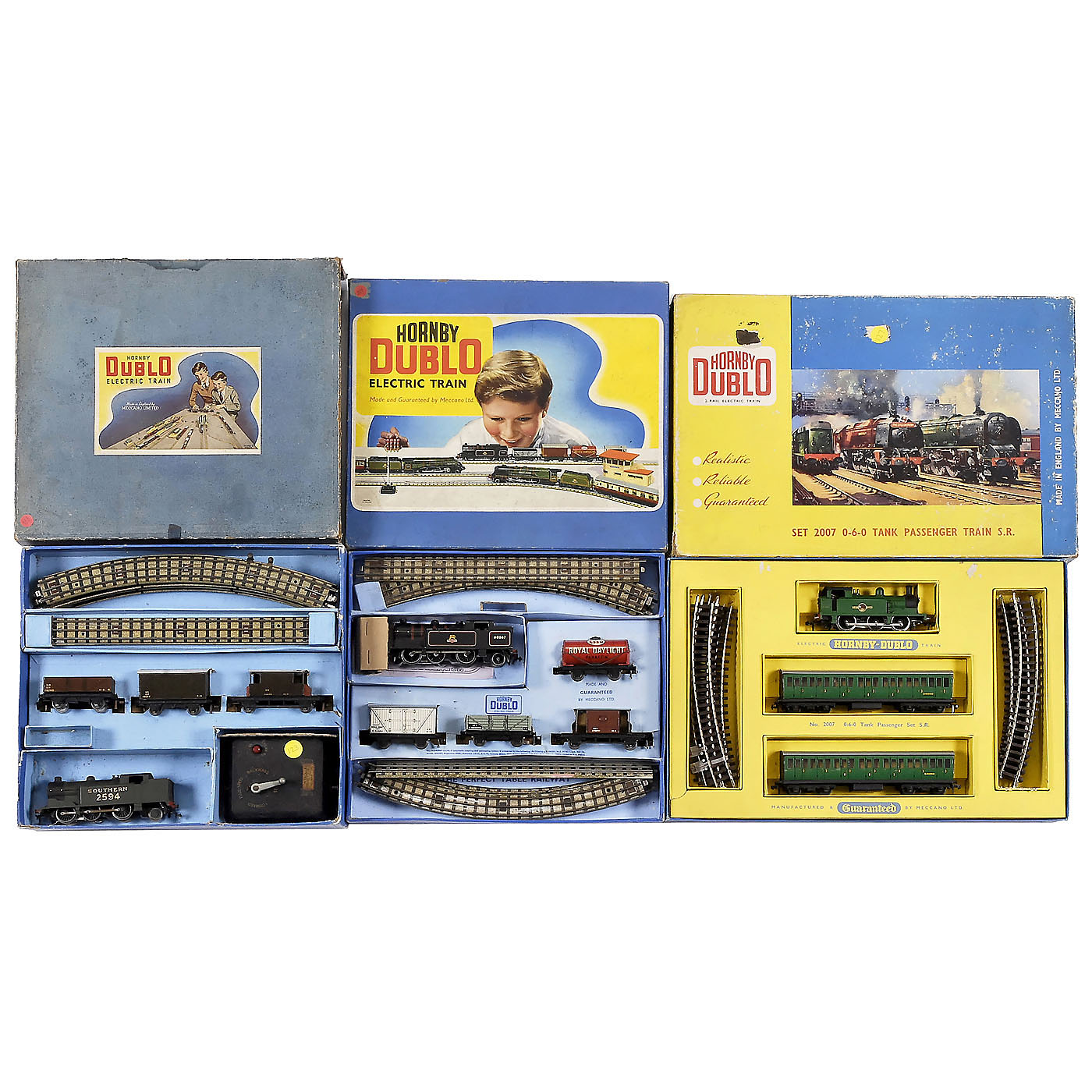 All Locomotives and cars in boxes, made in England. 1) Hornby Dublo EDL12 Duchess of Montrose, cast metal. - 2) Hornby Dublo gift set EDP2 passenger train Duchess of Atholl. - 3) Wrenn Railways 2221 Cardiff Castle, cast metal. - 4) Wrenn Railways 2224 LMS 8042, cast metal. - 5) Wrenn Railways 2237 Lyme-Regis, cast metal and plastic. - 6) A group of 6 Hornby-Acho passenger cars, comprising 4 x 735 "Voiture de Banlieue 2me classe" and 2 x 736 "Voiture de Banlieue 1re classe". - 7) Hornby Dublo EDL7 GWR tank locomotive. - 8) Hornby Dublo gift set EDP15 passenger train Silver King. - 9) Hornby Dublo gift set EDP1 passenger train Sir Nigel Gresley, coal imitation buckled. - 10) Hornby Dublo accessories: 2 x single arm distant signal 5066, 2 x island platform D1 and 1 x goods depot 5020. - 11) Wrenn Railways Pullman brown & cream 2 car sets 3006/7 The Brighton Belle, one power and one dummy trailing car. - 12) Wrenn Railways 2211 Mallard, cast metal. - 13) Hornby Dublo gift set EDG18 tank goods train. - 14) Hornby Dublo gift set 2007 tank passenger train. - 15) Hornby Dublo breakdown crane 4820. - 16) Hornby Dublo EDL17 tank locomotive. - 17) Hornby Dublo 2230 diesel electric locomotive D8017. - 18) Hornby Dublo 2233 diesel electric locomotive D5702. - 19) Hornby Dublo 3211 Mallard, cast metal. - 20) Hornby Dublo gift set EDG17 tank goods train. - 21) Hornby Dublo 2335 West Country locomotive Barnstaple, cast metal. - 22) Wrenn Railways 48073 freight locomotive, in Hornby box. - 23) Hornby Dublo 2250 and 4250, electric motor coach with trailer. - And: 24) Hornby Dublo EDG7, tank goods train set.