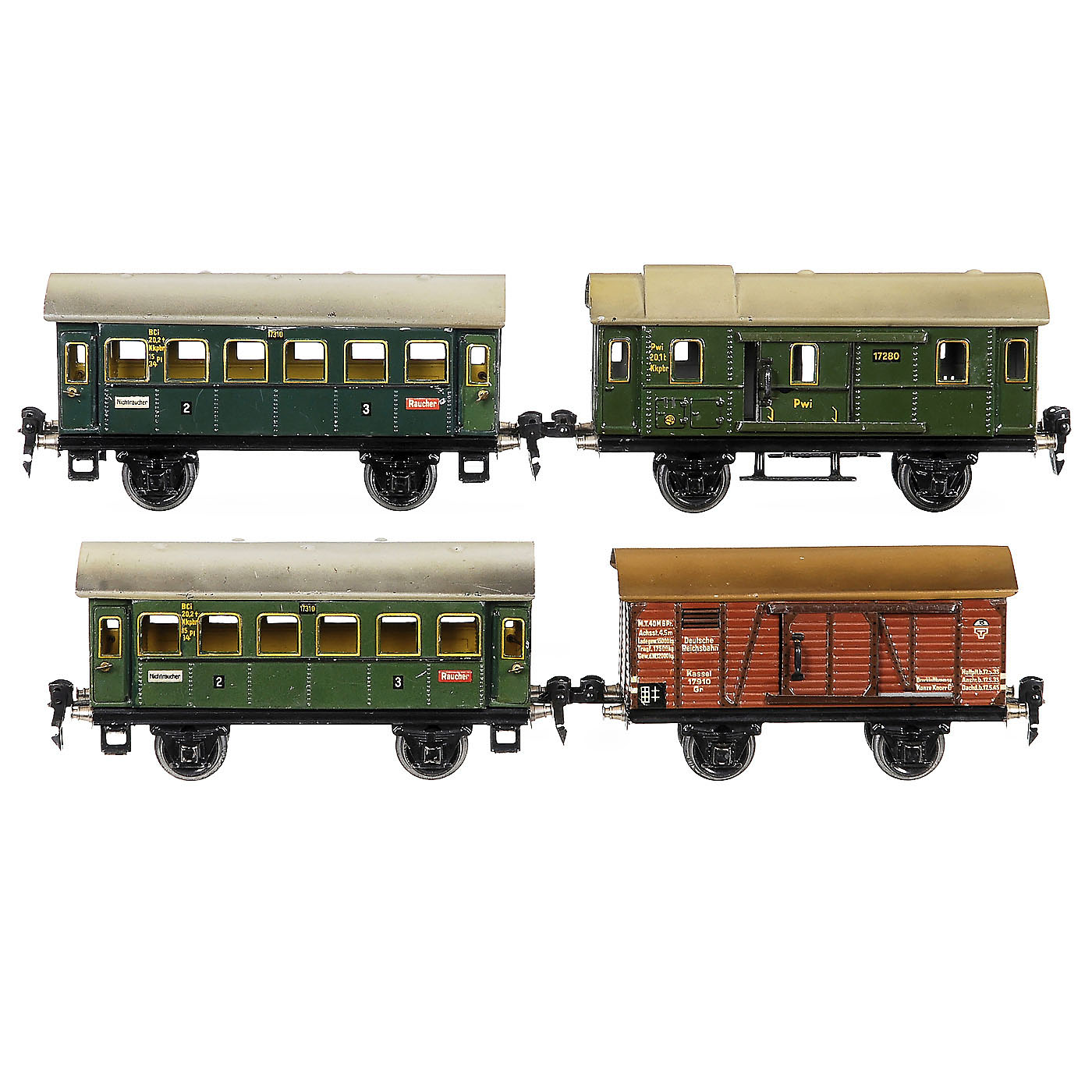 Lithographed tin, 2 passenger cars 17310, length 7 ¼ in., 1 baggage car 17280, length 7 ¼ in., and 1 closed goods wagon 17910, length 6 ¼ in.