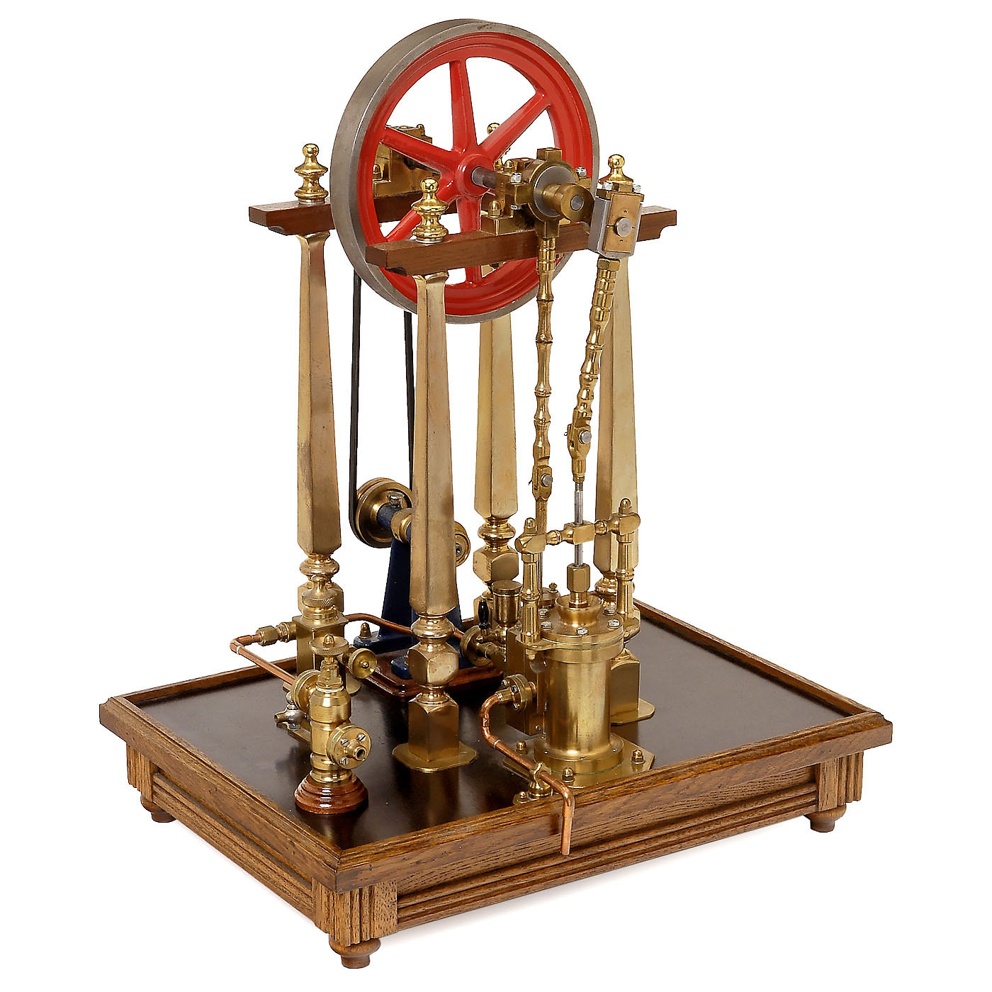 Finely engineered demonstration model, brass and steel, fixed cylinder Ø 2 1/3 in.! Circular slide-valve control, flywheel Ø 7 4/5 in., 4 brass columns, on wood base, overall size 17 ¾ x 13 1/3 x 23 1/5 in. - Complete with all fittings, working.