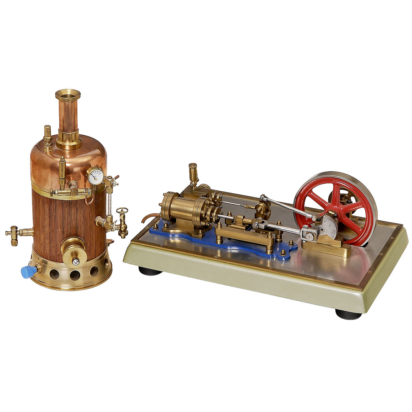 Cast iron, steel, copper and brass, gas-powered wood-planked copper boiler, Ø 4 1/3 in., with drain cock valve, water-gauge level, manometer, and safety valve; engine with 1 ¾ in. double-action cylinder, connection rod with crosshead guide, slide-valve control, flywheel Ø 5 in., on cast-iron base, size 15 2/5 x 9 ½ in., no tube between boiler and machine included, engine tested with pressure air, working.