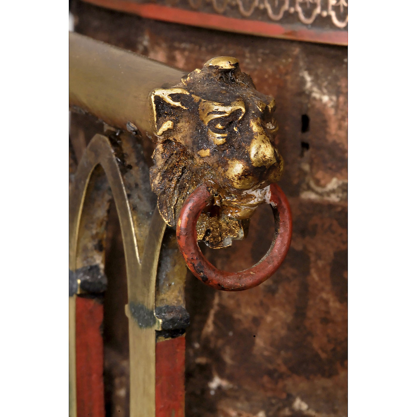 Presumably a Parisian World's Fair model, with steam engine plant by Radiguet & Massiot. Brass, steel and wood, with ornamented plaque inscribed "Crosby". Maker's steam indicator at the front, connected to the cylinder rod, wood-planked 5-inch boiler, steam whistle, weighted safety valve, water-gauge glass, manometer, double-action cylinder, working governor, brass-framed tiled floor, very decorative features, Art-Nouveau feet, overall size 26 1/3 x 13 ¾ x 23 1/5 in., no burner, tested with pressurized air, working. - One of the most beautiful steam engine models in very good original condition!