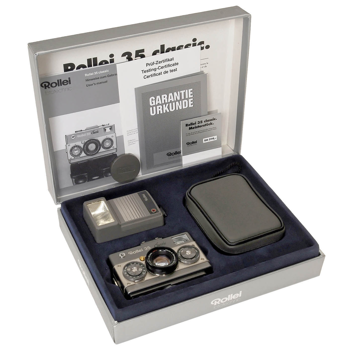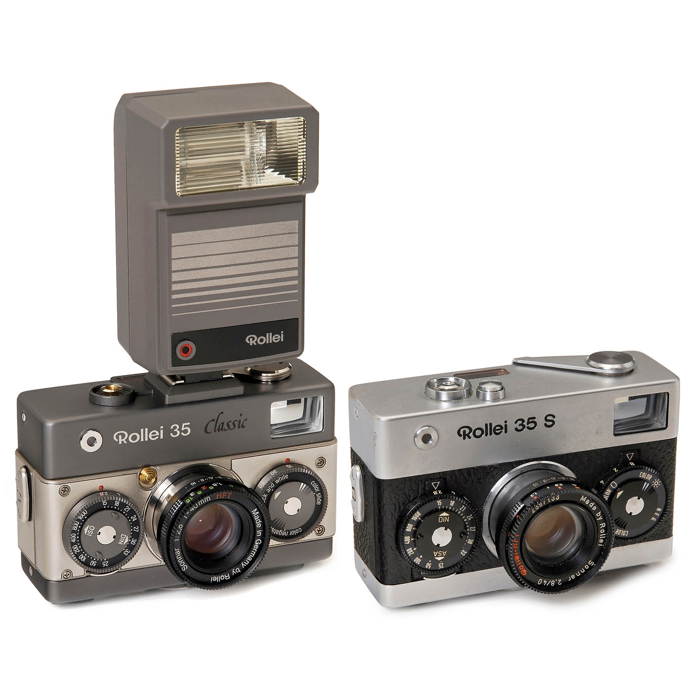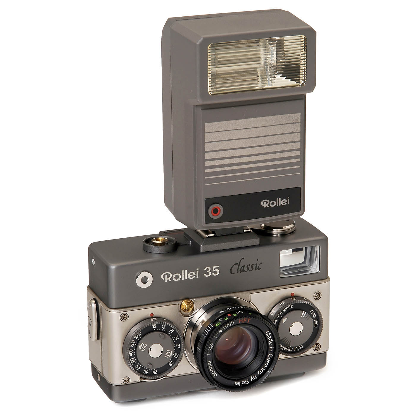 Rollei Fototechnik, Braunschweig. No. 6102597, Rollei Sonnar 2,8/40 mm HFT, special edition with improvements. Complete set with Rollei 20 REB electronic flash, maker's case, lens cap, papers and box. Only 6480 sets produced. - In addition: Rollei 35 S, Sonnar 2,8/40 mm, case, English manual, 4 Rollei lens caps.