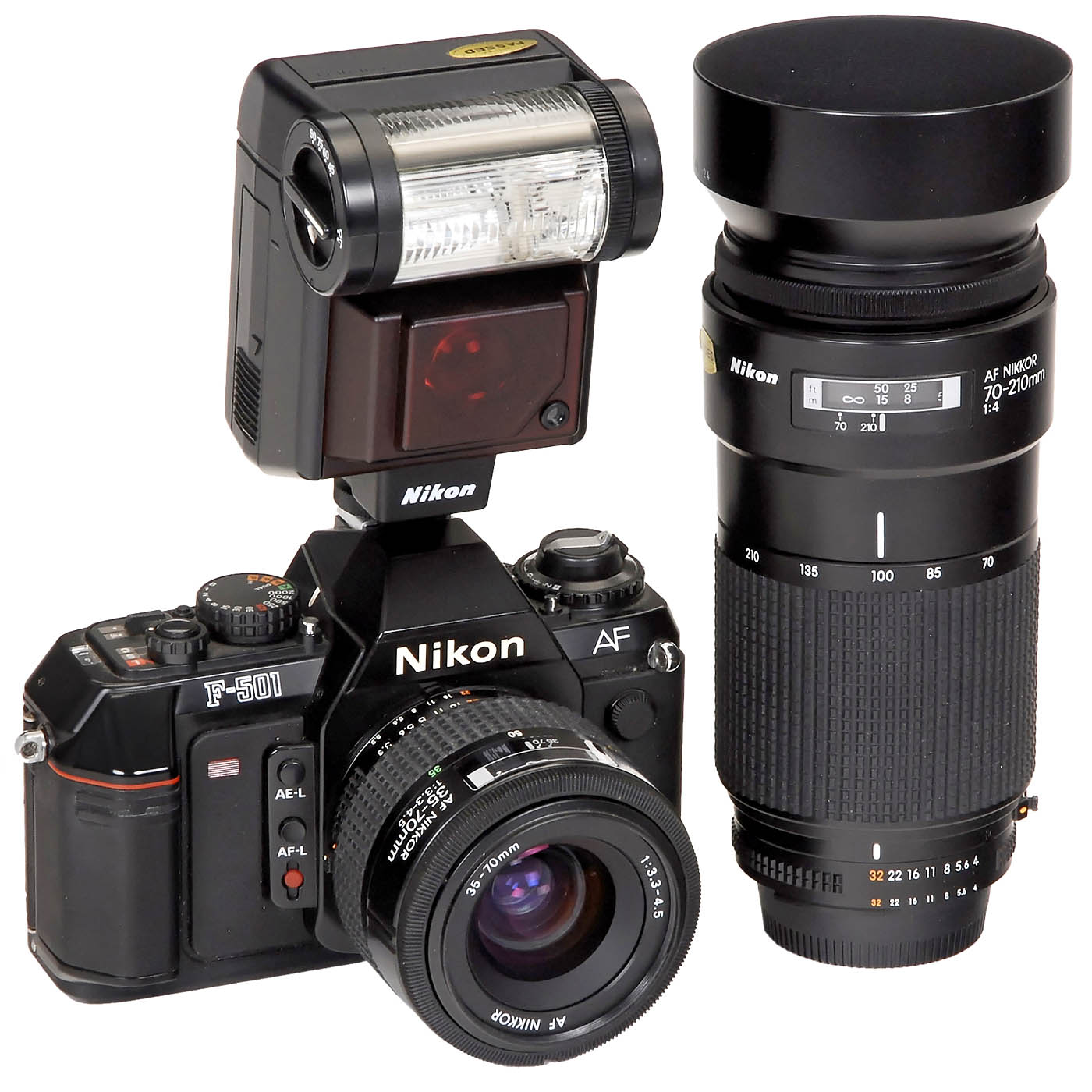 Nikon, Japan. First Nikon autofocus SLR camera. With AF Nikkor 3,3-4,5/35-70 mm, AF Nikkor 4/70-210 mm, Nikon Speedlight SB-20, lens hood, filters, flash cable Nikon SC-17, cable release MC-12A. - In addition: Polaroid Impulse AF and aluminum case. - Cameras untested.