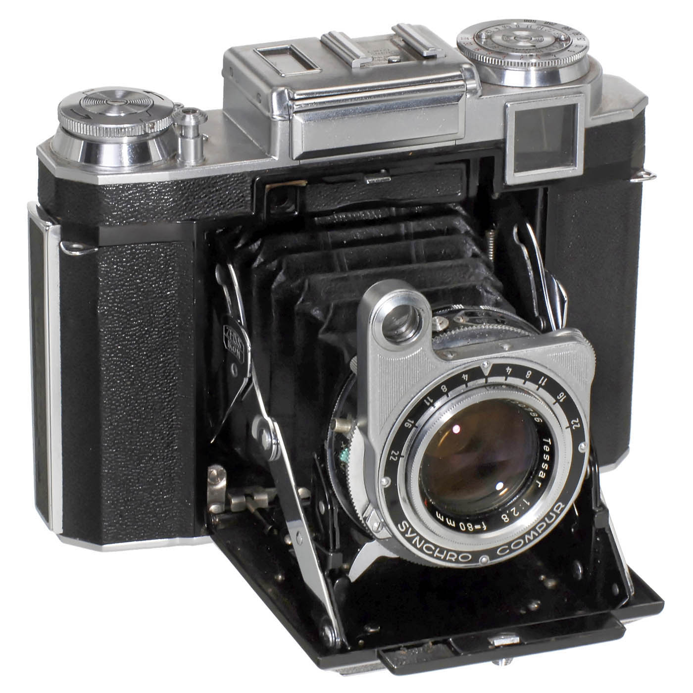 Zeiss Ikon, Stuttgart. Post-war version of model 533/16, size 6 x 6 cm, body no. A 41575, with Opton-Tessar 2,8/80 mm T no. 1120786, Synchro-Compur, coupled rangefinder, and working lightmeter, body in excellent condition, with case. - Sought-after Super Ikonta model!
