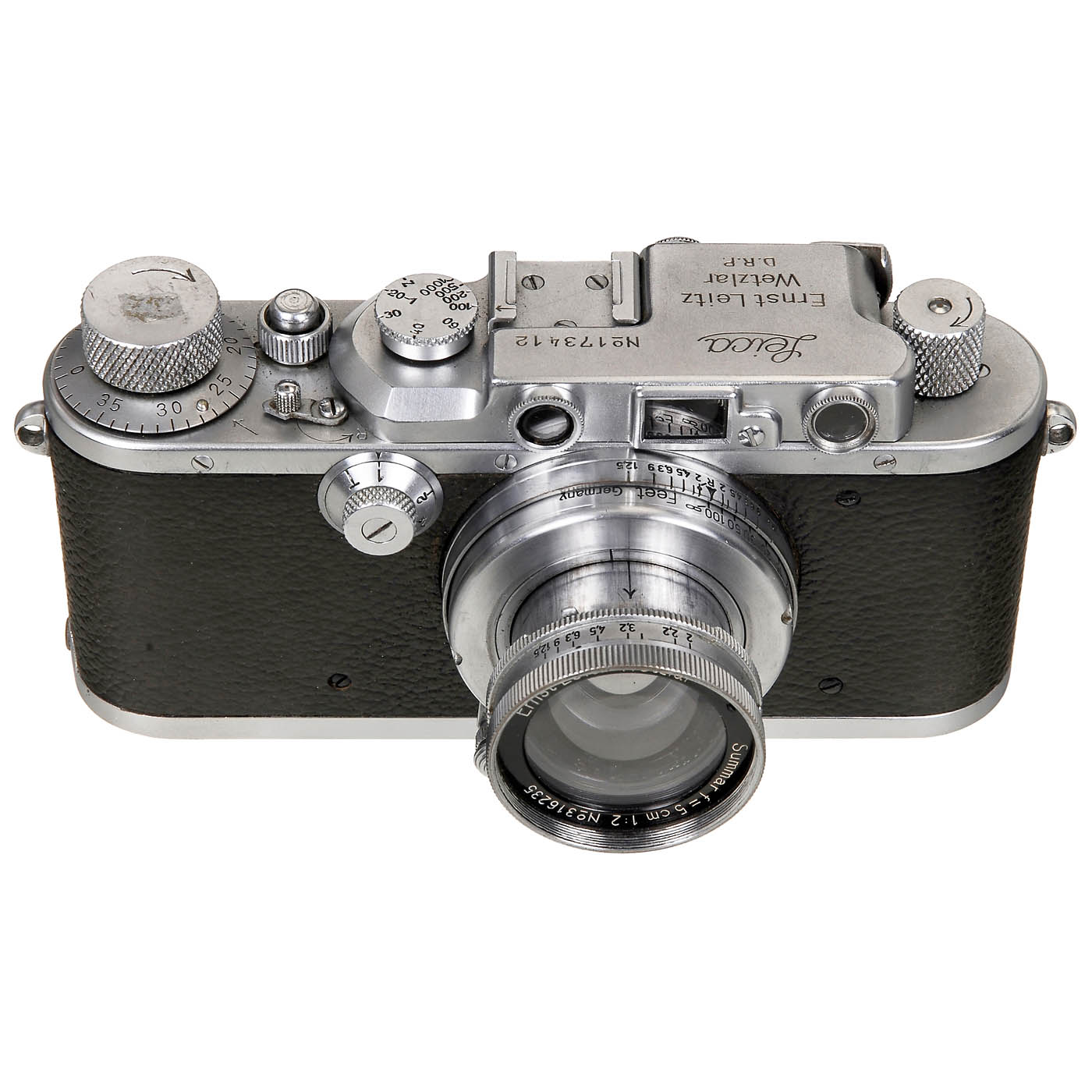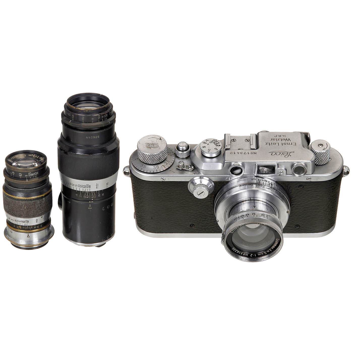 Leitz, Wetzlar. no. 173412, chrome, top plate and covering in excellent condition. With 3 lenses: a) Summar 2/5 cm, no. 316235; b) Elmar 4/9 cm, no. 454115; c) Hektor 4,5/13,5 cm, no. 440926.