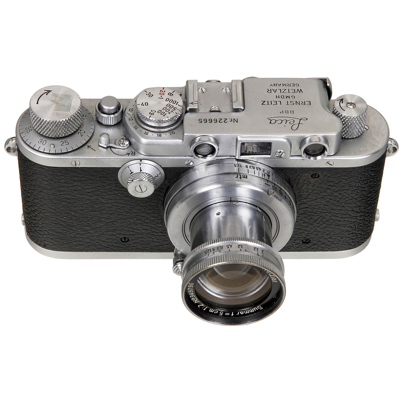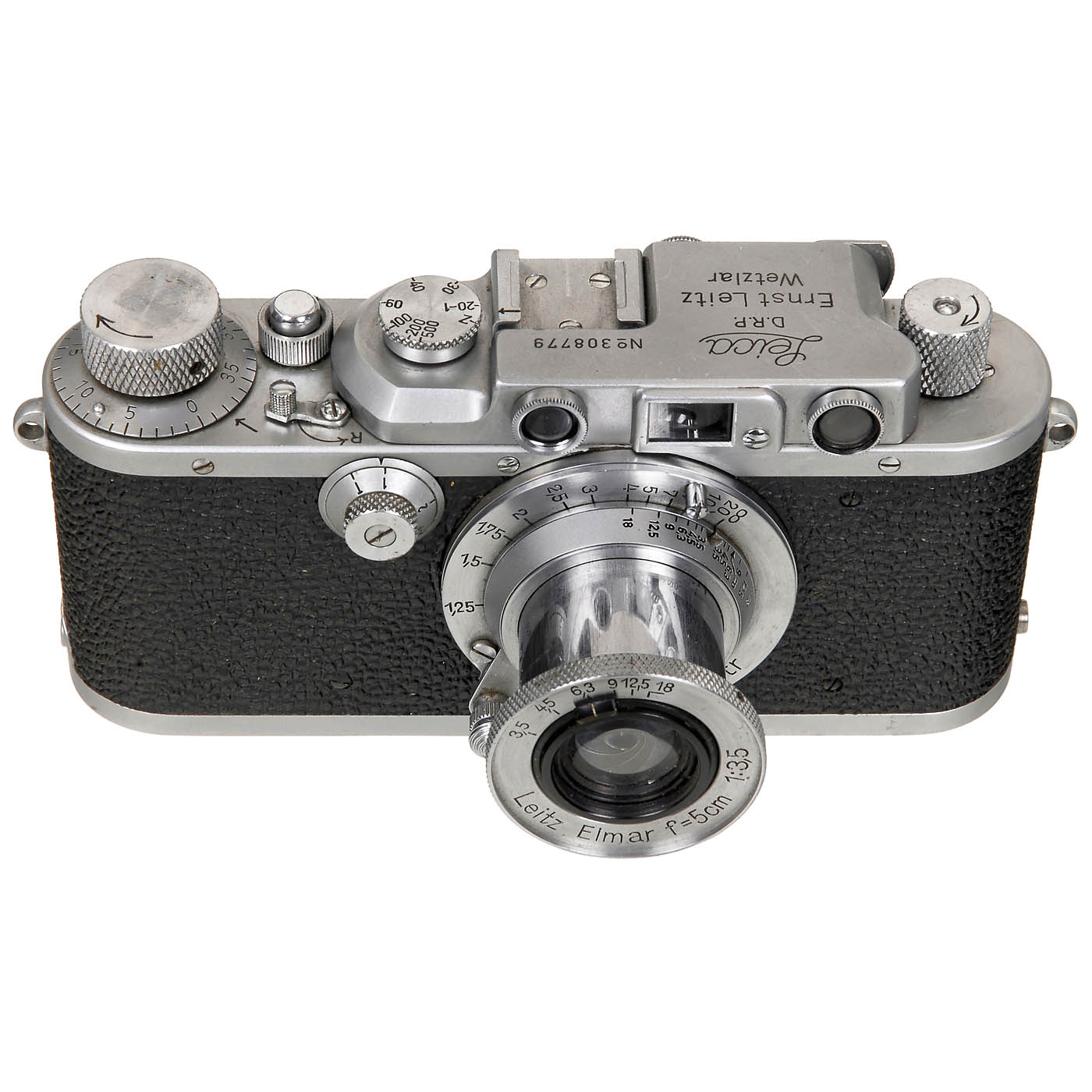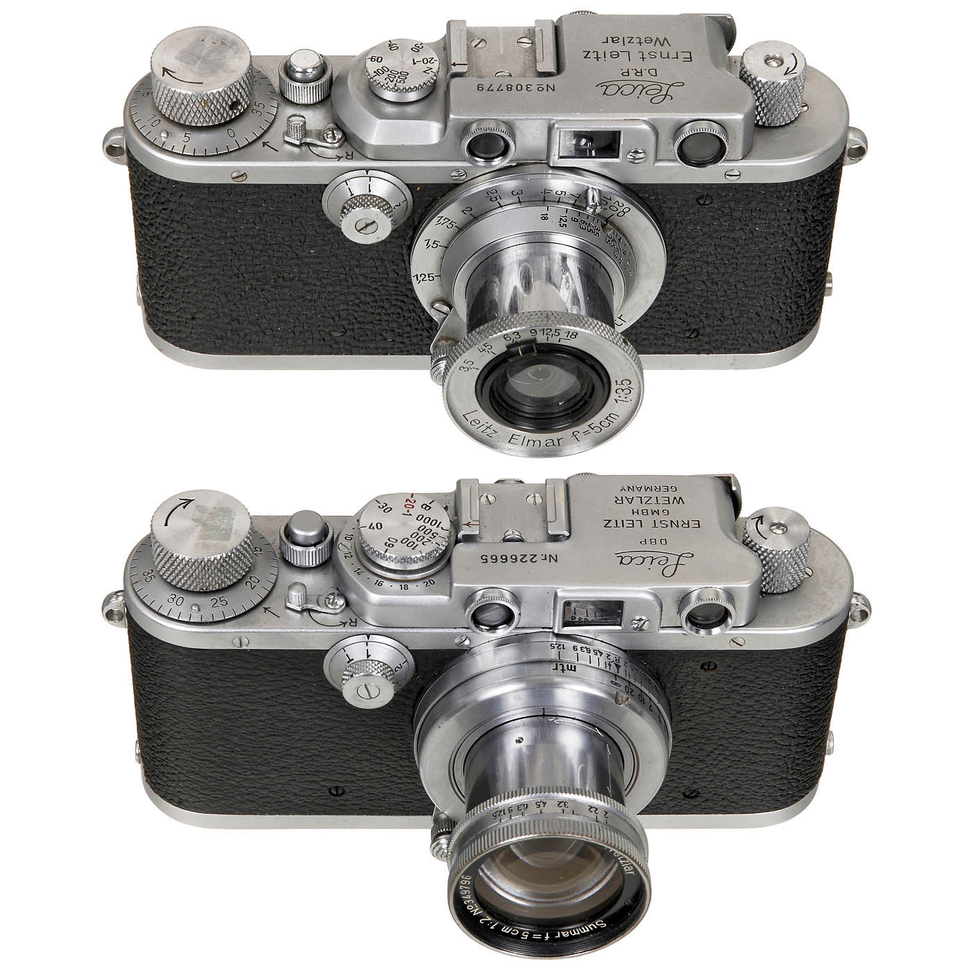 Leitz, Wetzlar. 1) Leica III (F), 1938, no. 308779, chrome, Elmar 3,5/5 cm, no. 536288, long shutter speeds stuck, otherwise in good condition. (3-2/3) - And: 2) Leica IIIa (G), 1936, no. 226665, chrome, synchronization, black-dial synchronization, Summar 2/5 cm, no. 349796. (2-3/2)