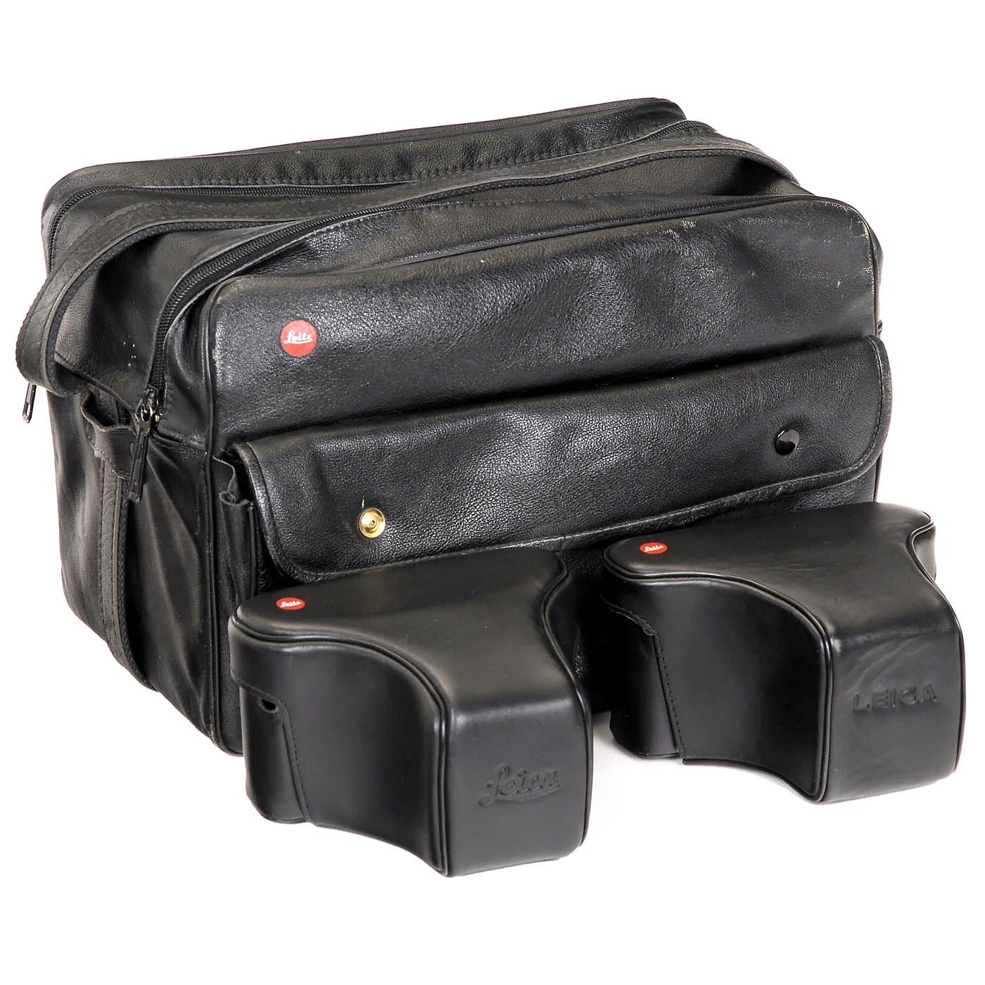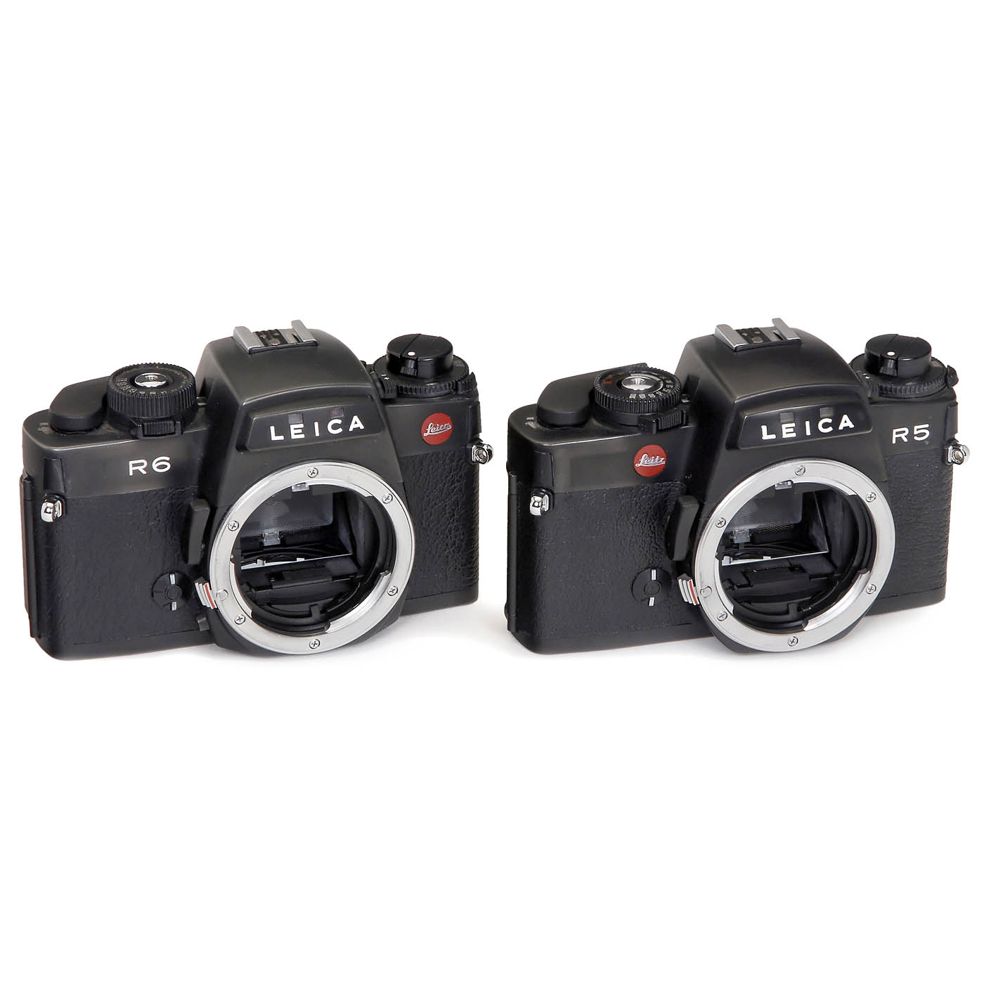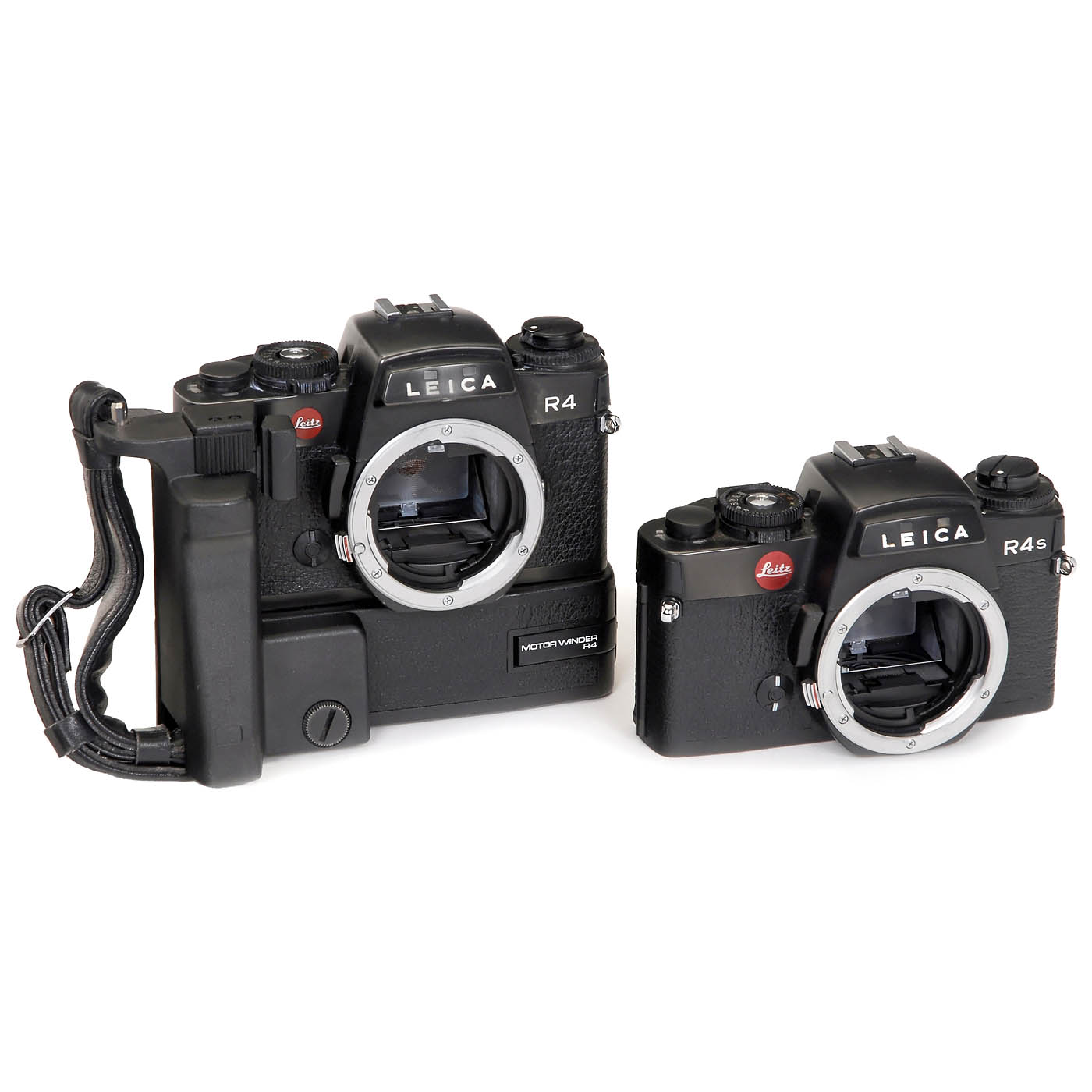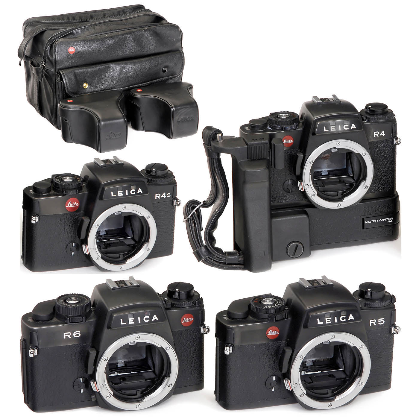 Leitz, Wetzlar/Portugal, and Leica, Solms. 1) Leica R4, no. 1660385, with Motor Winder R4 and grip, body cap. (3/-) - 2) Leica R4s "Portugal", no. 1633985, body cap. (3+/-) - 3) Leica R6, no. 1729744, body cap. (2/2+) - And: 4) Leica R5, no. 1697723, body cap. (3-2/-) - In addition: 2 maker's cases, "Handbuch des Leica Systems", instruction manuals, straps and large leather Leica case for "R"-system.