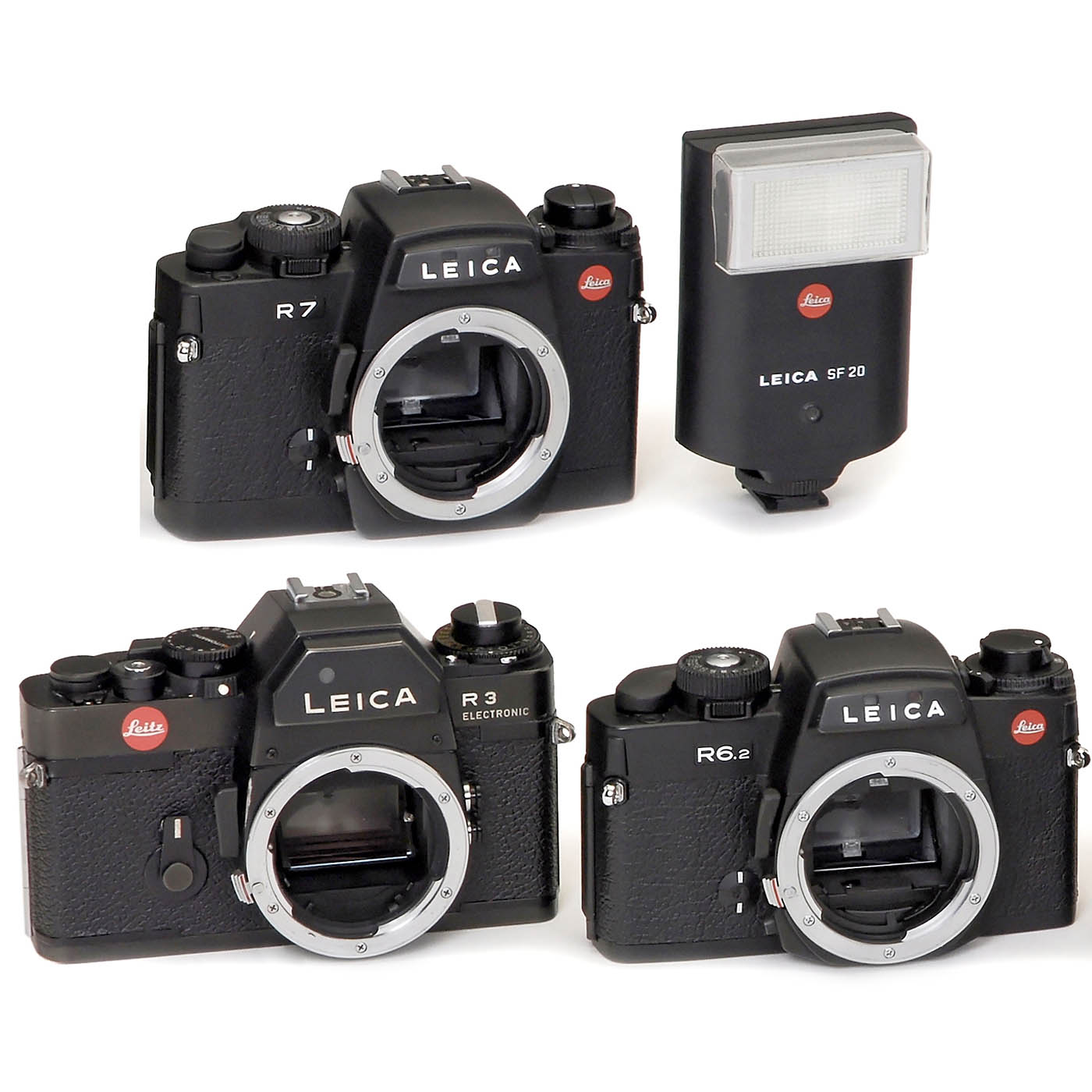 Leitz, Portugal and Germany. 1) Leica R3 electronic, "Portugal", no. 1474008, body cap. (3/-) - 2) Leica R6.2, "Germany", no. 1902969, black, body cap. Sought-after mechanical Leica-R camera, excellent condition. (1-/1) - And: 3) Leica R7, "Germany", no. 1910796, body cap, excellent/mint condition. (1-/-) - In addition: Leica flash SF20, maker's case for R6.2 and R3, straps and instructions.