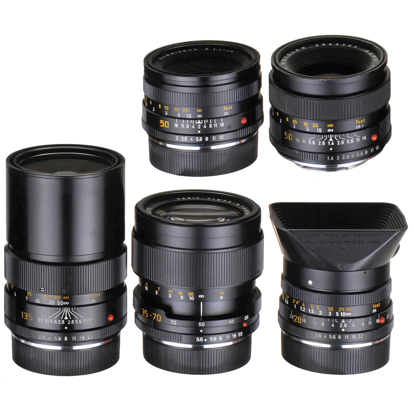 Leitz. 1) Wetzlar. Elmarit-R 2,8/28 mm, type 11247, 3-cam, no. 3185495, rear cap and lens hood 12509. (2-/1) - 2) Canada. Summicron-R 2/50 mm, type 11216 "For Leica-R only", no. 3113843, 2 caps. (2+/1) - 3) Wetzlar. Summilux-R 1,4/50 mm, type 11776, 3-cam, no. 2953363, 2 caps. (3/1-) - 4) Leitz, Japan. Vario-Elmar-R 3,5/35-70 mm, type 11248, no. 3244866, 2 caps. (2/1) - And: 5) Canada. Elmarit-R 2,8/135 mm, type 11211, no. 3029141, 3-cam, UVa filter and 2 caps. (2-3/1)