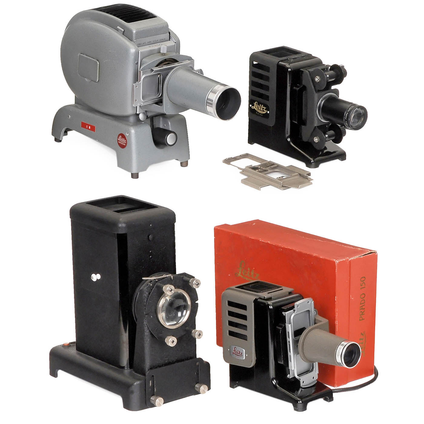 Leitz, Wetzlar. 1) Leitz UBODI model VIII J, without lens. - 2) Leitz Parvo, bakelite housing, Hektor 2,5/8,5 cm, with slide changer and film strip attachment. In fiberglass case. - 3) Leitz PRADO 150, bakelite housing, Hektor 2,5/8,5 cm, with slide changer. With box and instructions. - And: 4) Leitz PRADO 250, Colorplan 2,5/90 mm.