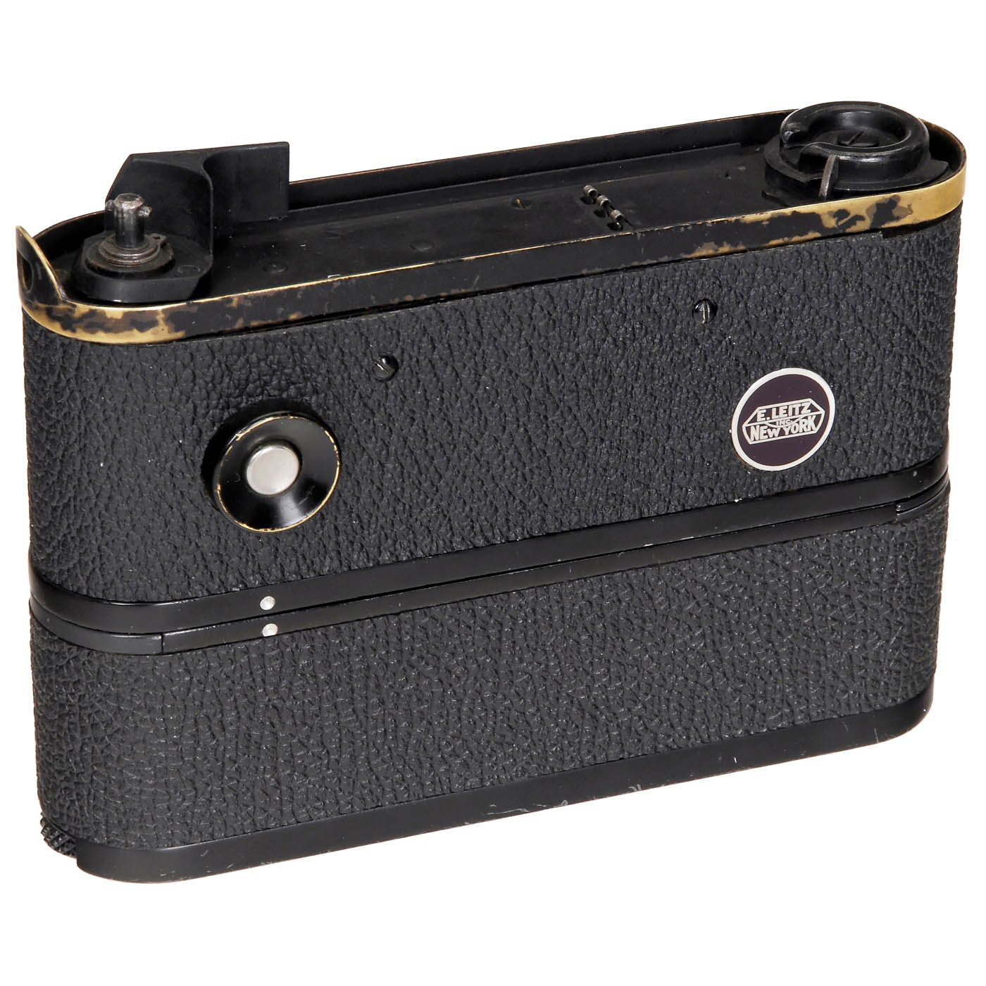 Leitz, New York. This motor for Leica M was developed by Technical Photomation Instruments (TPI). Here a late version with "E. Leitz New York" logo and film loading guide. Battery pack with milled TP logo. Untested.