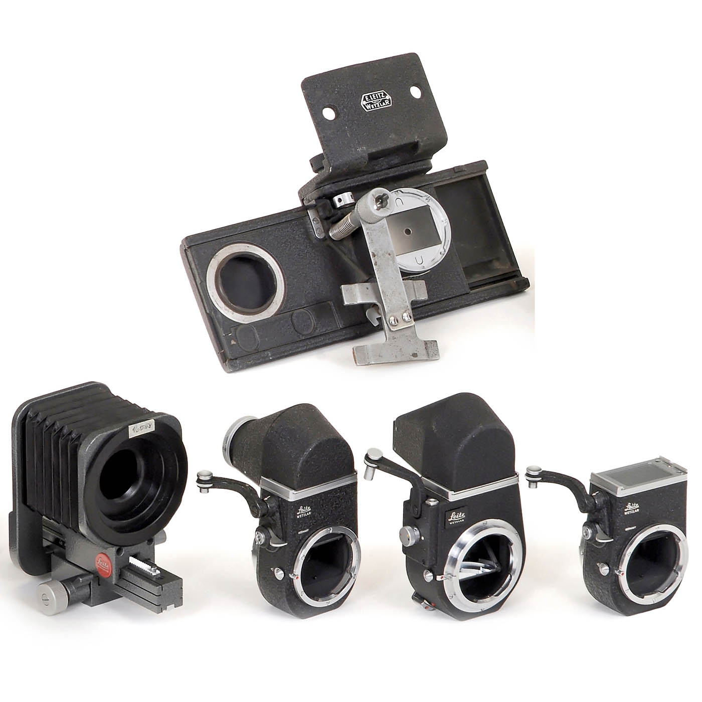 Leitz, Wetzlar. 1) Reflex housing PLOOT with magnifier LVFOO. - 2) Visoflex I, OZYXO, for screw-mount, with LVFOO. - 3) Visoflex I, OZXOM, for Leica M, with LVFOO. - 4) Bellows I, 3/8 in., with compendium shade UZEOO. - And: 5) Bellows I, ¼ in.