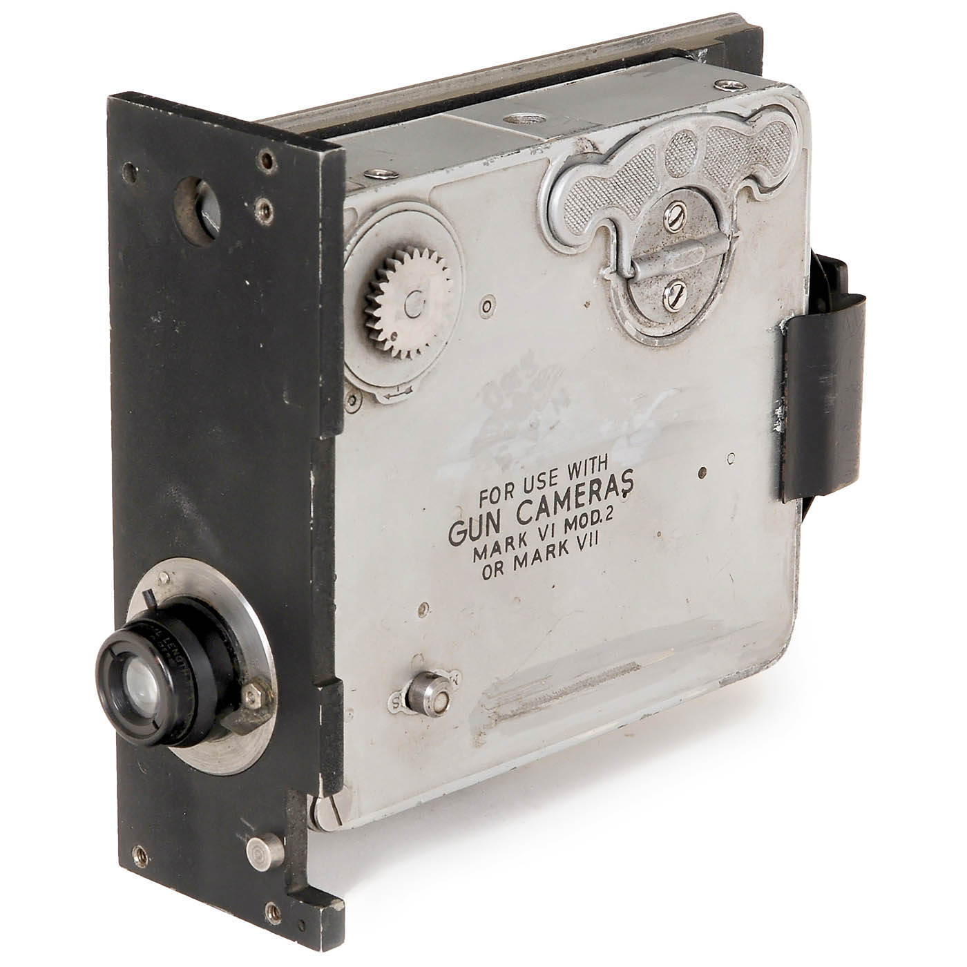Internationale Projektor Co., New York, USA. Gun camera for 16 mm film, clockwork drive for 12 and 16 p/s. and step motion, Bausch & Lomb lens 3/35 mm, clockwork. - First American 16 mm camera, working.