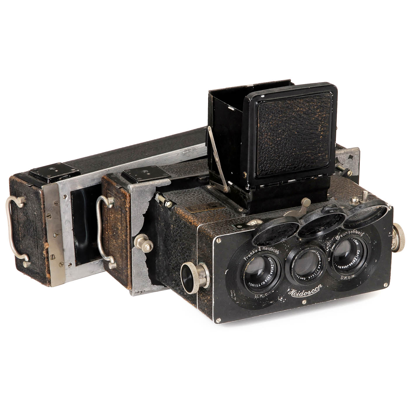 Franke & Heidecke, Braunschweig. Stereo camera for plates of 6 x 13 cm with plate-changing magazine for 12 plates, lenses: Carl Zeiss Jena Tessar 4,5/7,5 cm, iris diaphragms 4,5 to 25, pneumatically-controlled central shutter Z, B, 1-1/300 sec. (slow speeds incorrect), distance setting from 1 m to ∞, reflex viewfinder with folding finder hood and ground-glass, with second plate magazine, paint loss, with case.