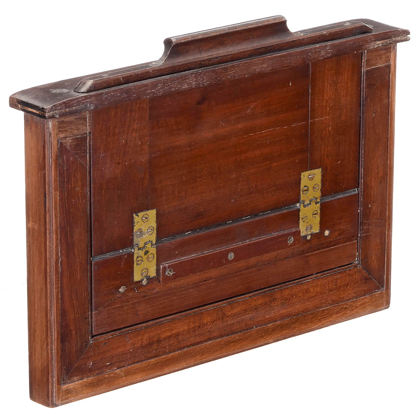 Unmarked. Size 3 1/6 x 6 3/4 in. (8 x 17 cm), polished wood, size of the camera: 10 x 9 x 6 3/4 in. (l/b/h), camera with minor collodion stains, focusing screen back and one cassette. With 2 landscape lenses, unmarked, rack-and-pinion focusing, adjustable base. - Camera in very good unrestored condition!