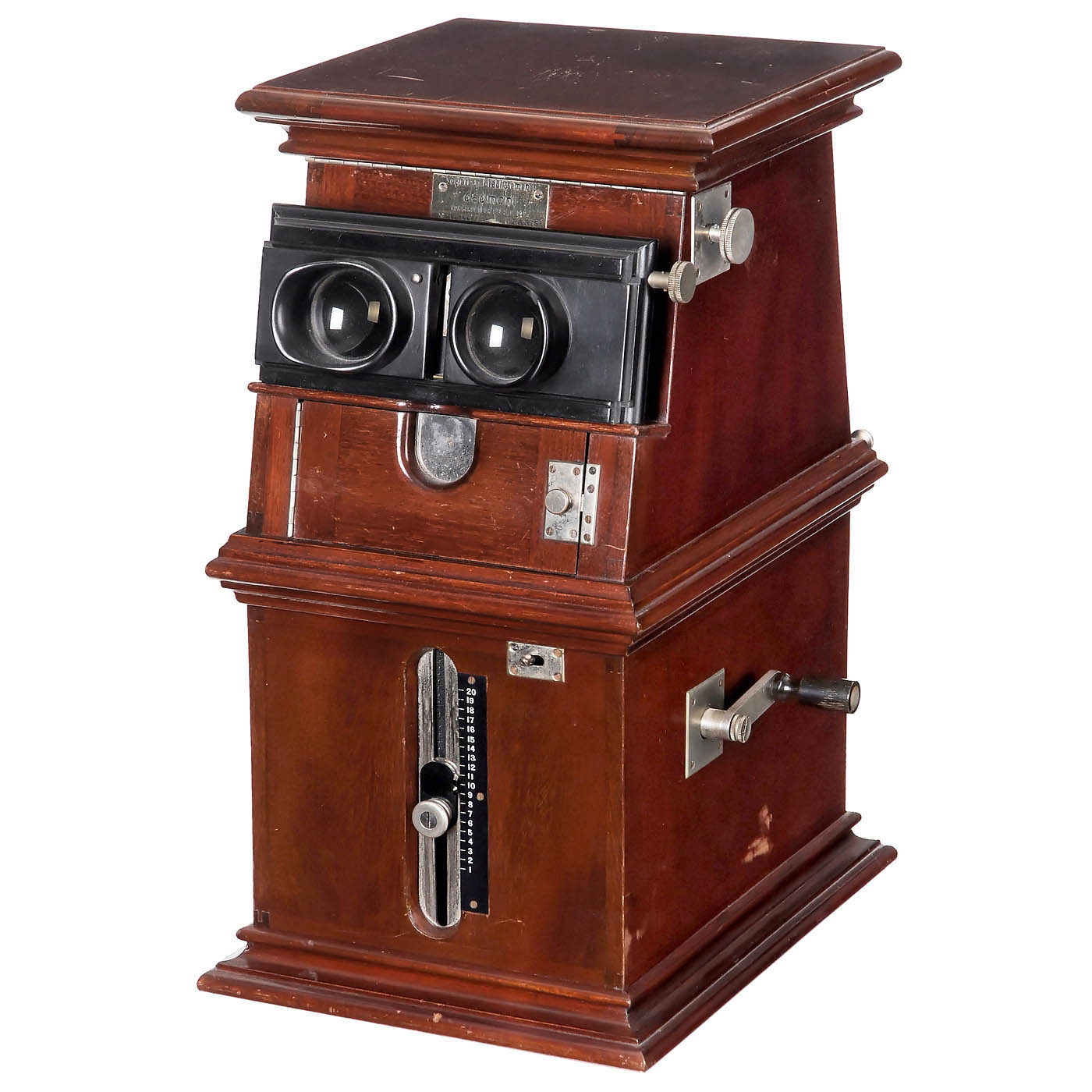 L. Gaumont & Cie., Paris. Series viewer for stereo slides of 45 x 107 mm, polished mahogany body, focusing by rack and pinion, adjustable interocular distance, uses magazines with 20 slides each, very solid mechanical slide-changer, without magazines.